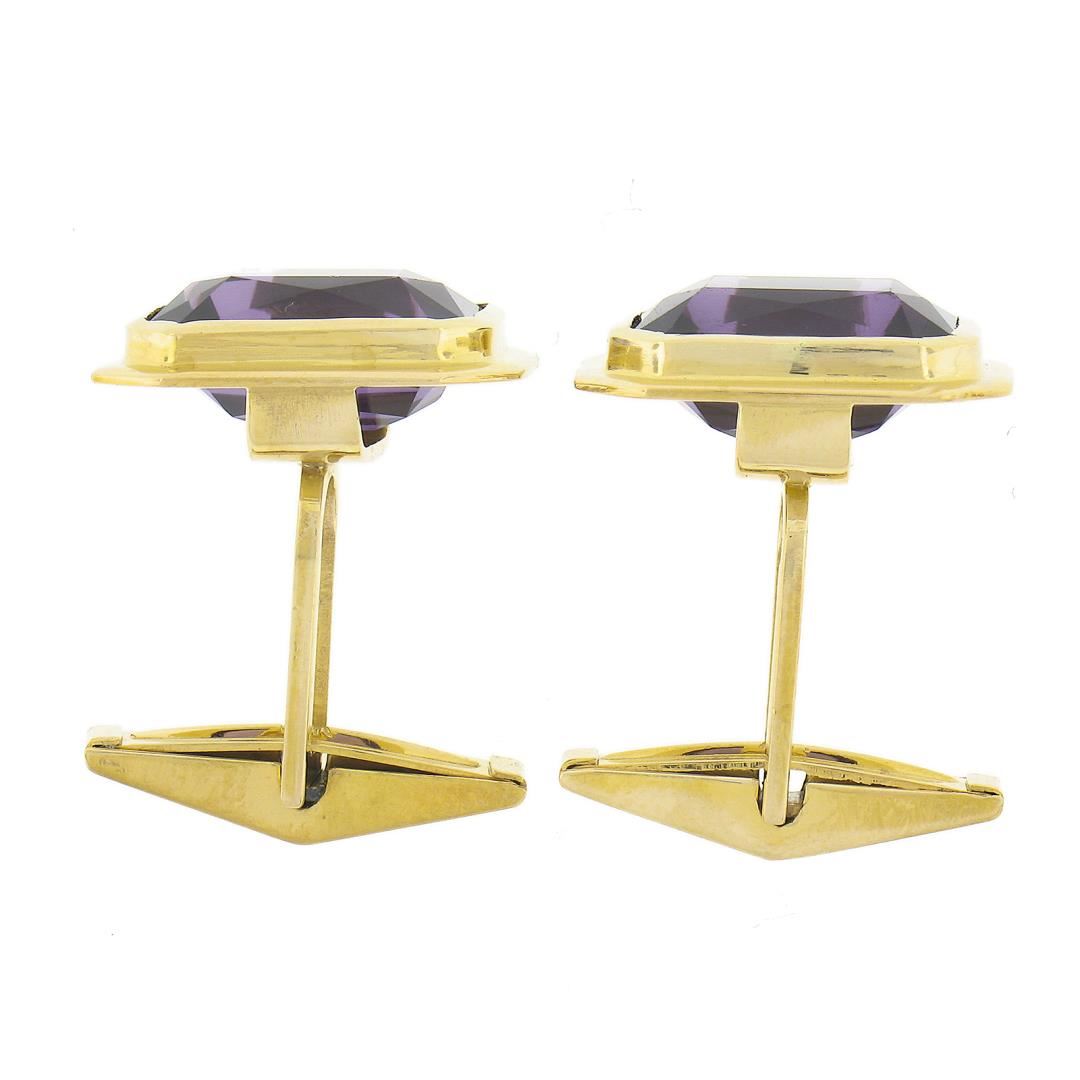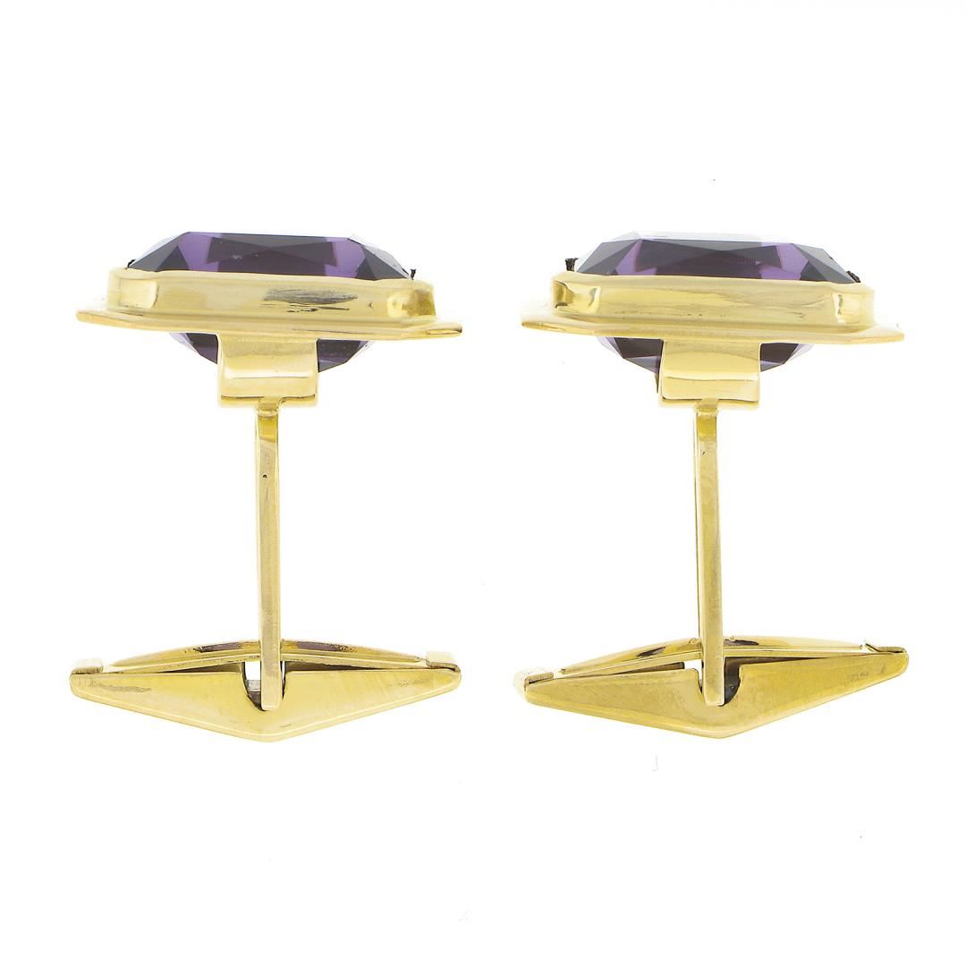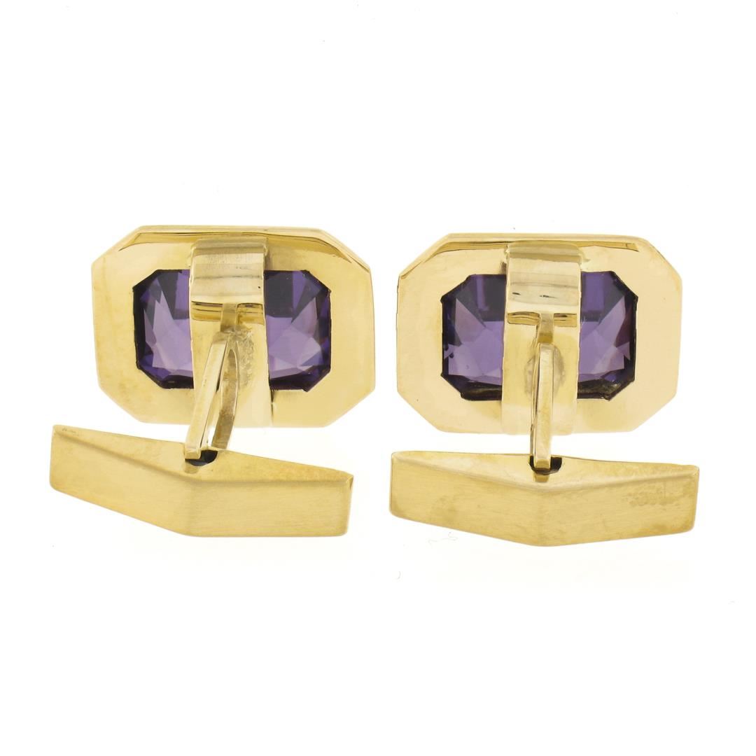 A vintage solid 14k yellow gold cufflinks, with 2 rectangular cut synthetic alexandrite's (12.7x9.9mm). These cuff links have a swivel design with a clearance of 10.8mm, weigh a total of 11.83 grams, and the front panels measure 17.4x14.5mm.
