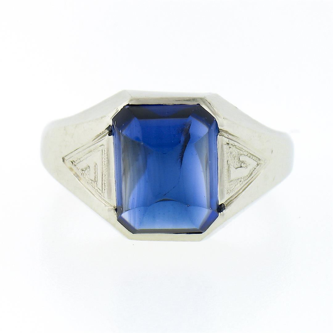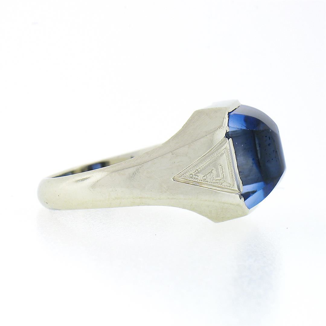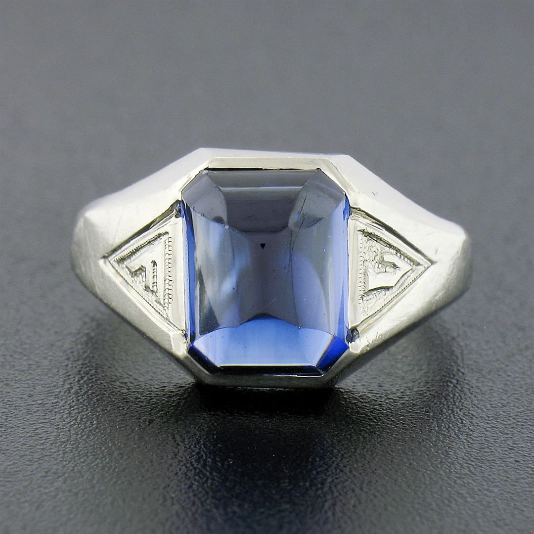 A vintage solid 14k white gold men's band ring, with 1 custom rectangular cabochon cut blue stone (9.8x8.0mm). The ring is size 7.5, weighs a total of 5.15 grams, and measures 11.45mm wide.