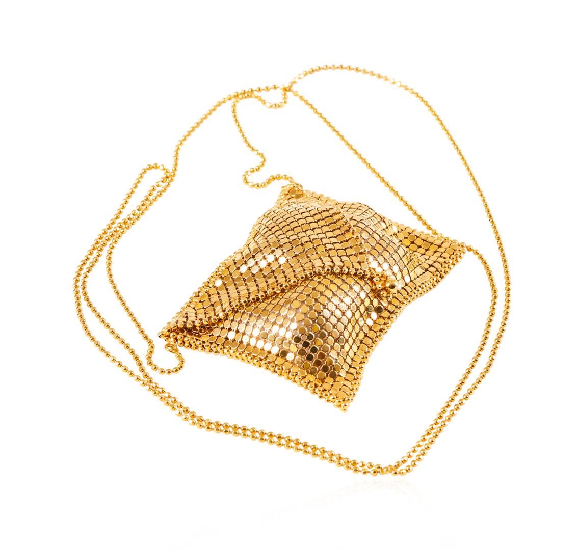 One electronically tested 14KT yellow gold ladies hand crafted mesh purse. The mesh purse, reminiscent of the Roaring Twenties' "Jazz Age", features a network of interconnected flattened plate links, completed by an envelope style flap with a safety closure. Dimensions of the purse measure four inches wide by three inches long. The purse is supported by a forty-eight inch length 14KT yellow gold beaded chain strap. Identified with markings of "ITALY 14Kt". Condition is good. Total Weight of Mesh Purse 96.50 gm. AIG Appraised at $14,990.00.