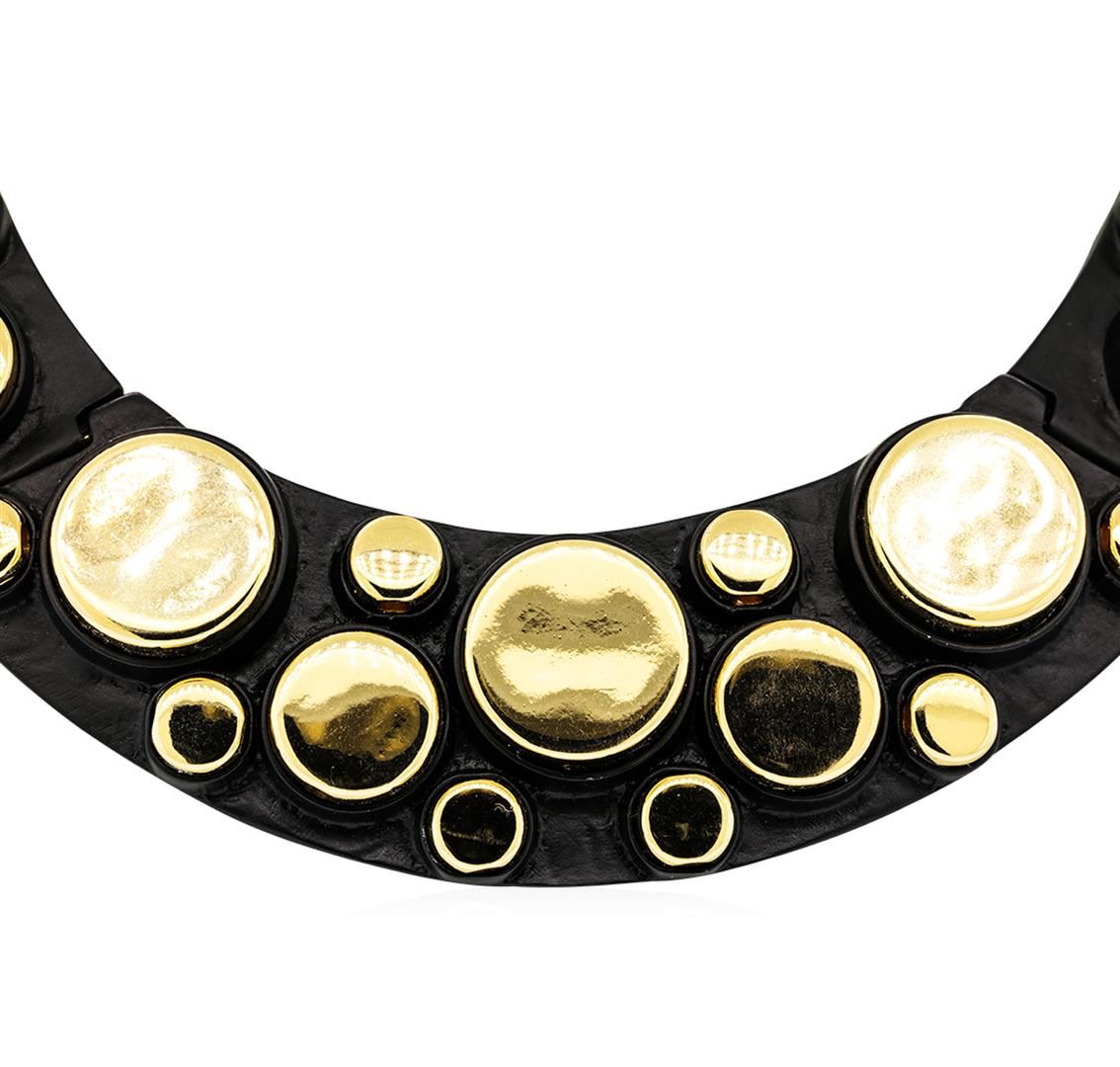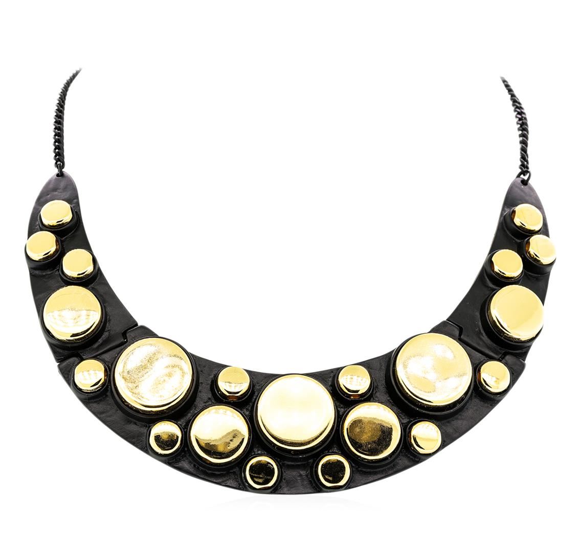 High end designer jewelry. Metallic Button Bib Necklace - Black Plated. Black Tone Basic Metal/2.5" Ext Clasp. Black/ Gold. 16inches.