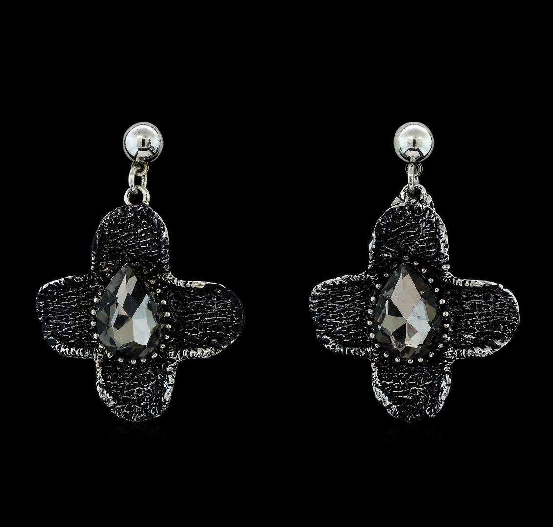 High end designer jewelry. Metallic Crystal Earrings - Silver Plated. Silver Plated Metal/1.5" Dangle. Slv/ Blk/ Smok. Post.