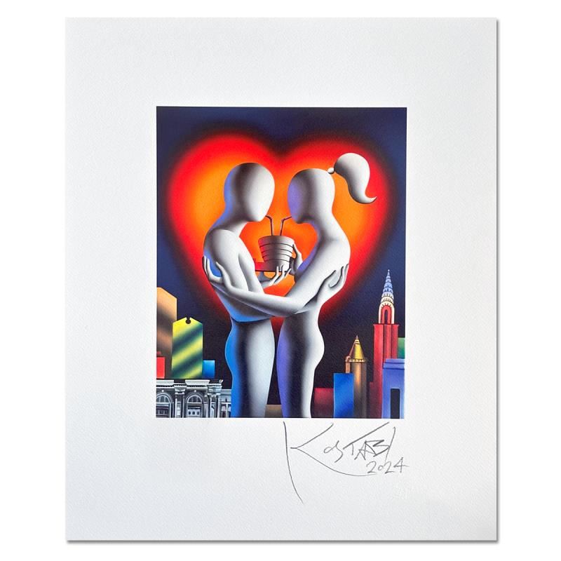"Metropolitan Passion" is a limited edition giclee on paper by Mark Kostabi. The piece is hand signed and numbered and comes with a certificate of authenticity. Measures approximately 12.5" x 10" (image).