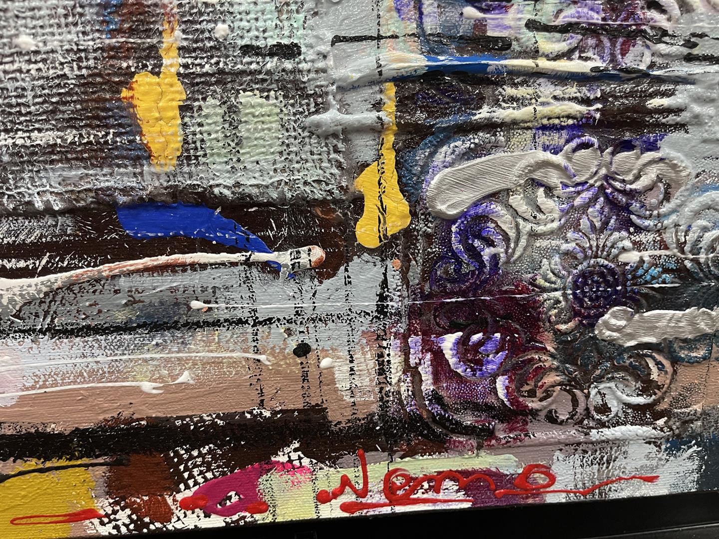 Fascinating original mixed media on canvas, hand signed by artist, this artwork comes gallery wrapped.Approximately 24x60 inches.