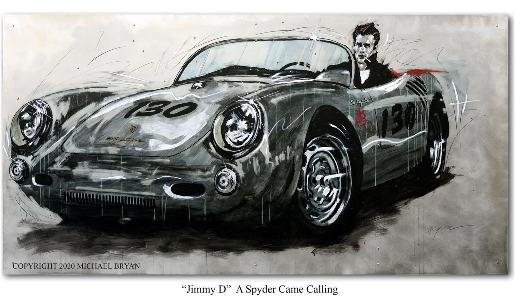 Michael Bryan's "Jimmy D " is a 20x40" handworked giclee on canvas, commemorating the great James Dean in his famous Porsche Spyder.