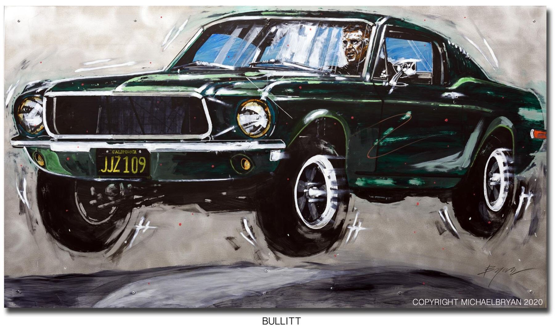 Michael Bryan "Bullitt" is a handworked Uniquw 1/1 giclee on canvas 22.5x40" The movie's dark green mustang roars into your living room.