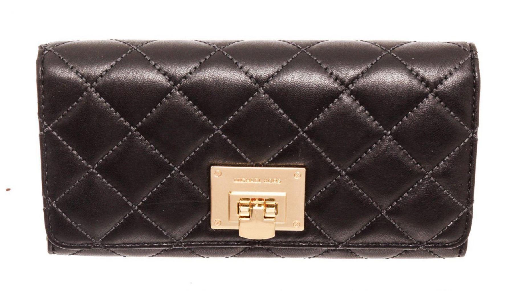 Michael Kors black Astrid leather flap lock wallet with gold-tone hardware, logo placard at front, five interior compartments; one with zip closure, sixteen cardholder slots and overall flap lock closure at front. Measurements: Length: 7.85 in / 20 cm Width: 1.2 in / 3 cm 4.8 in / 12 cmCONDITION: Pre-Owned Good overall, please see photographs for detail.