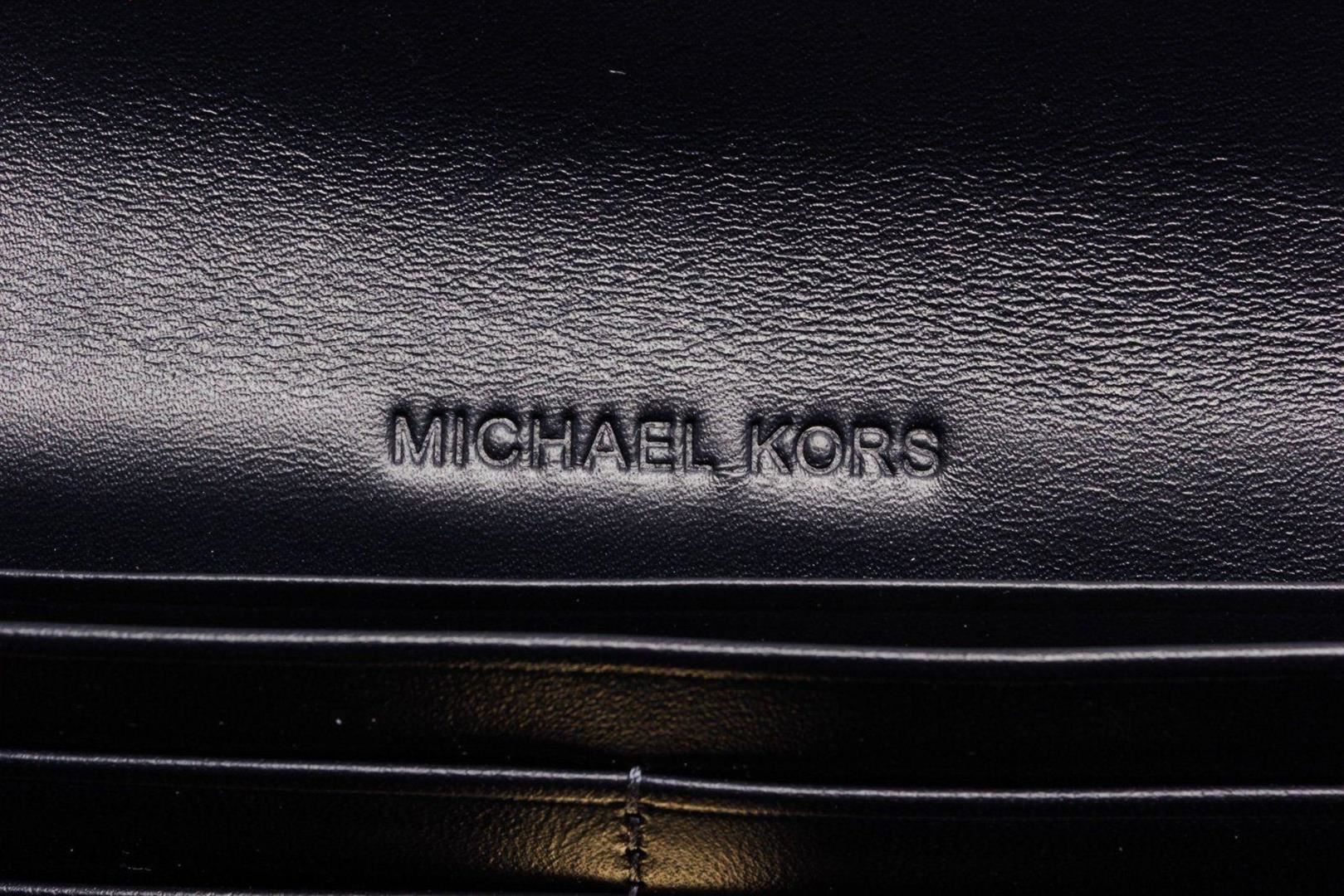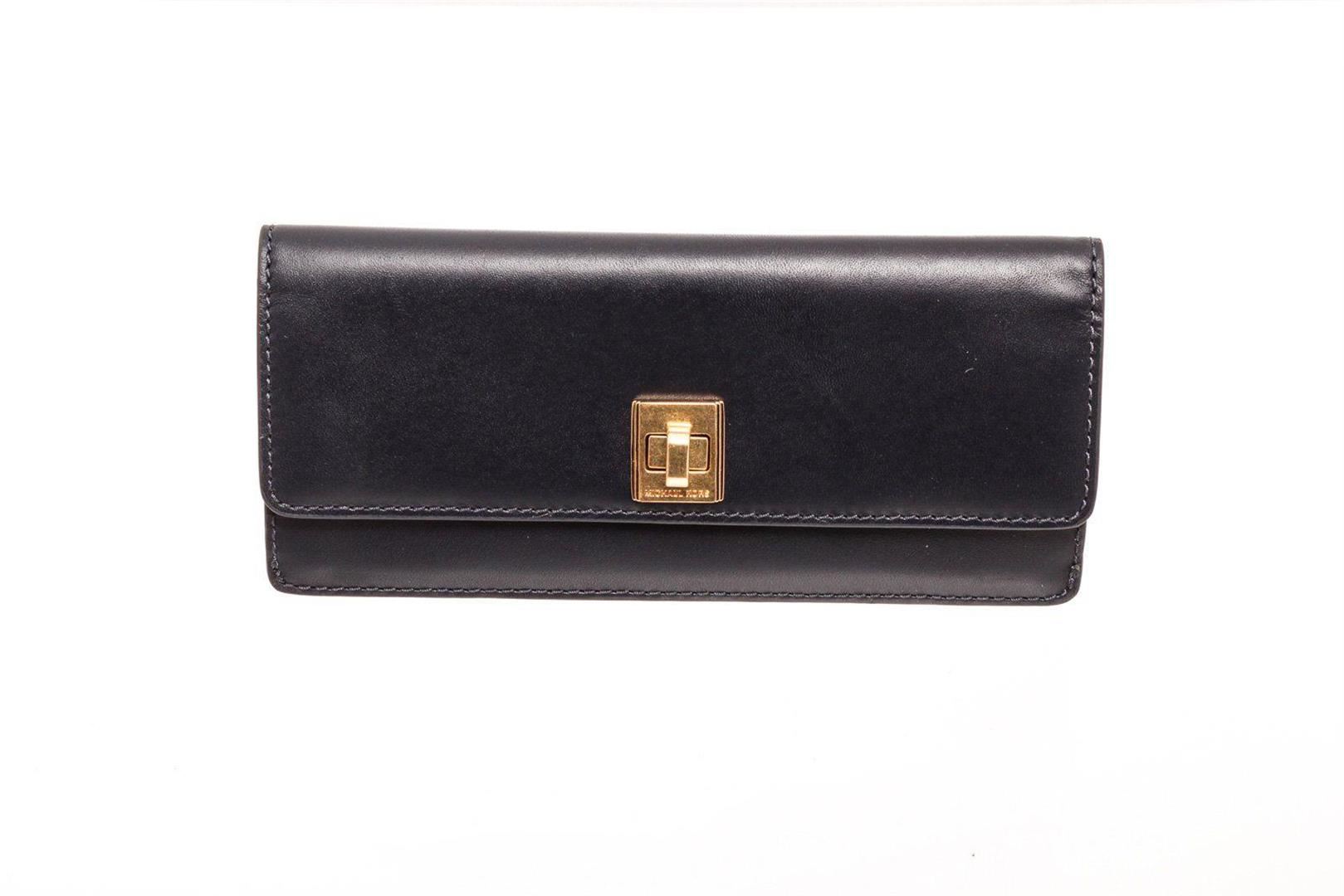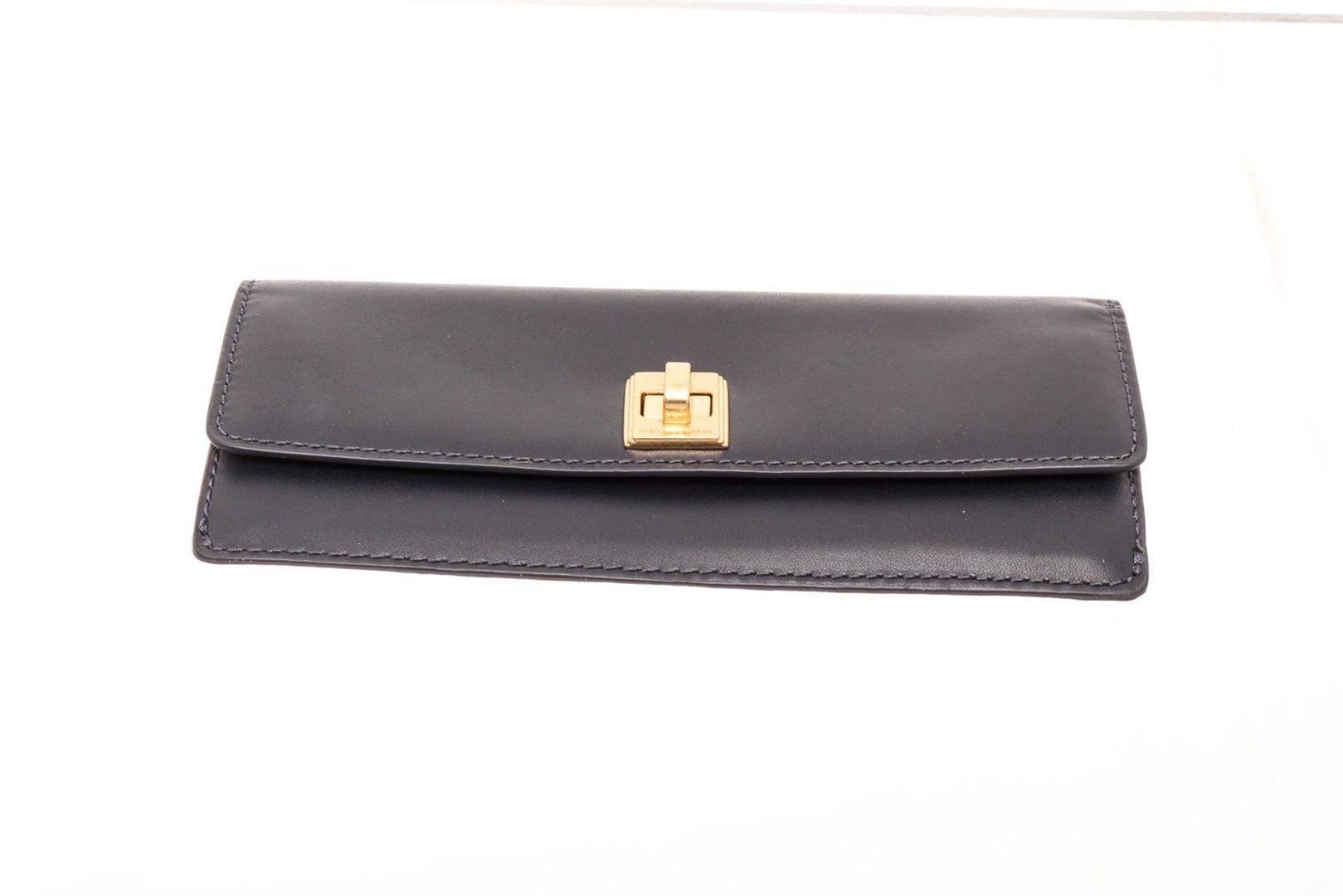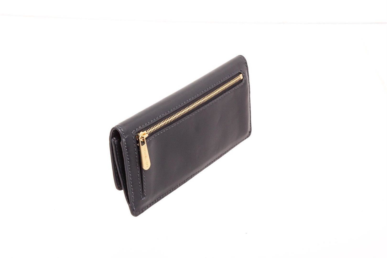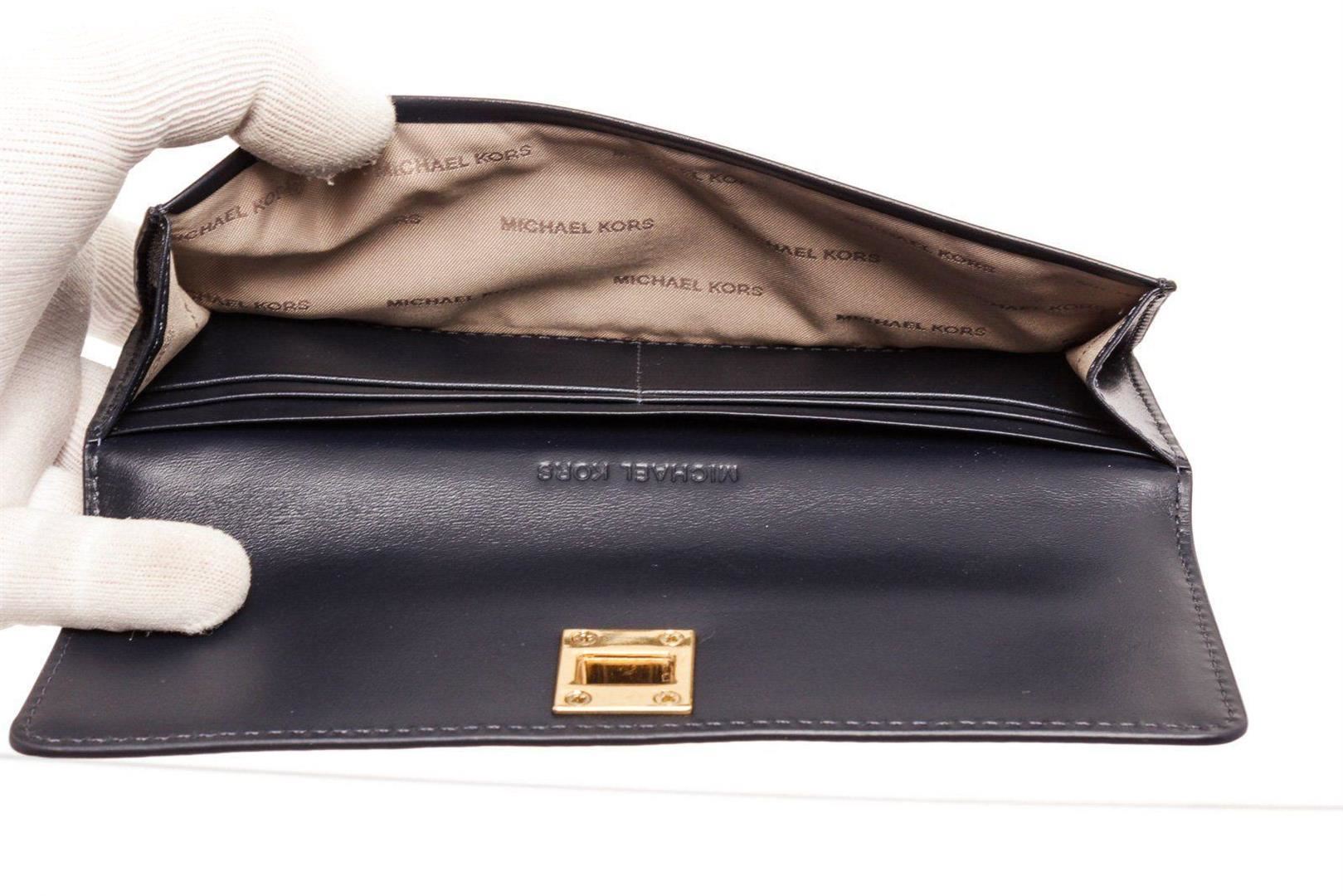 Michael Kors navy leather Natalie flat wallet with gold-tone hardware, single zip pocket at back, logo placard at front, tan logo canvas interior lining, two interior compartments, eight cardholder slots and overall turnlock closure at front. Measurements: Length: 7.8 in / 20 cm Width: 0.75 in / 2 cm 3.65 in / 9 cmCONDITION: Pre-Owned Good overall, please see photographs for detail.