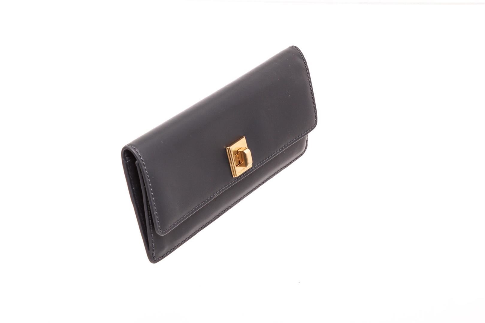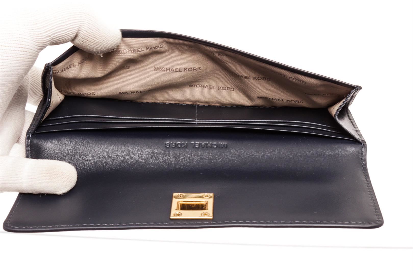 Michael Kors navy leather Natalie flat wallet with gold-tone hardware, single zip pocket at back, logo placard at front, tan logo canvas interior lining, two interior compartments, eight cardholder slots and overall turnlock closure at front.