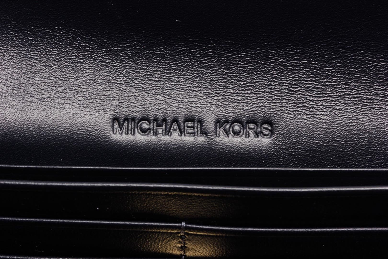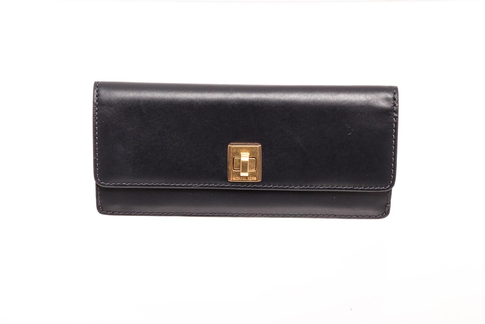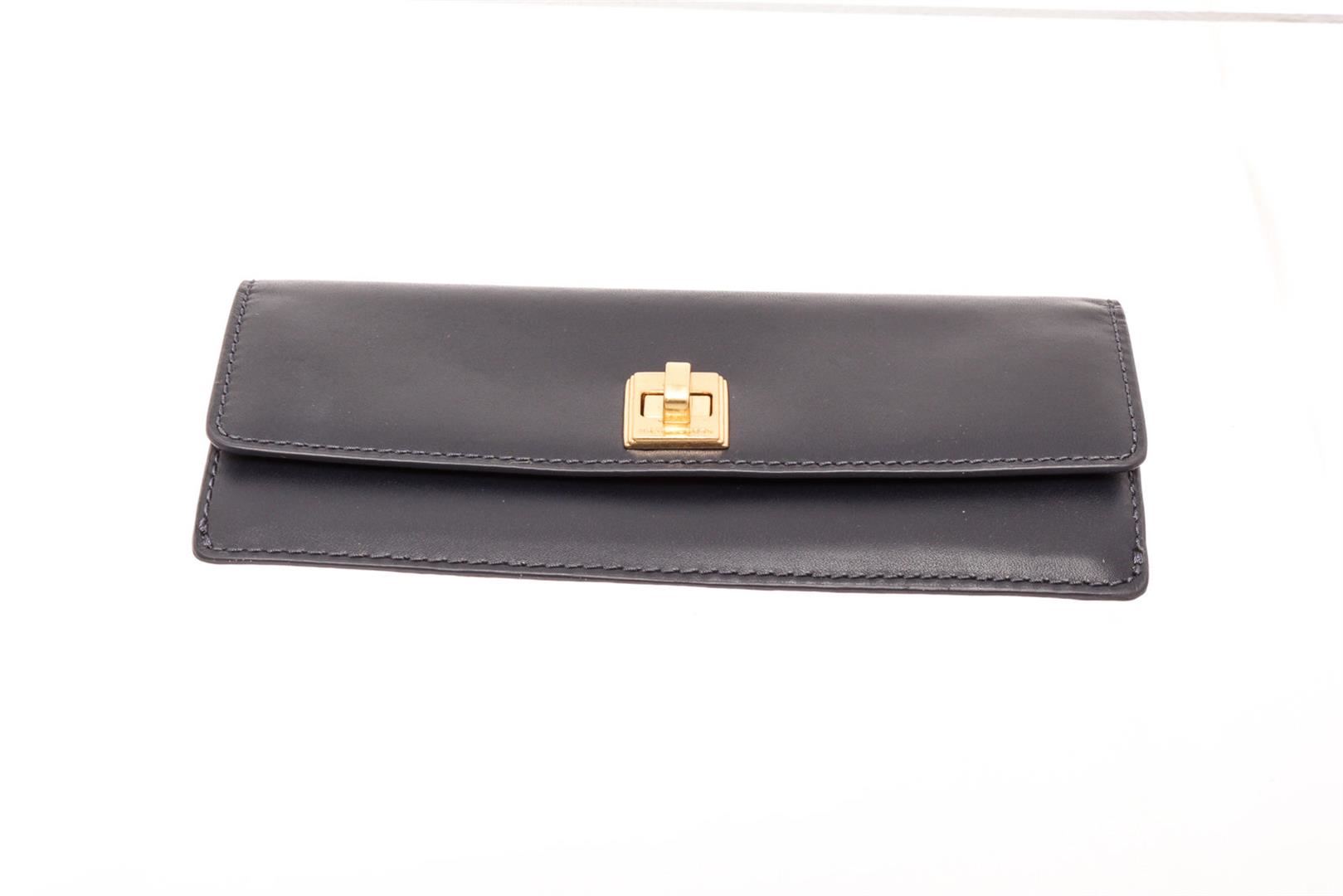 Michael Kors navy leather Natalie flat wallet with gold-tone hardware, single zip pocket at back, logo placard at front, tan logo canvas interior lining, two interior compartments, eight cardholder slots and overall turnlock closure at front.