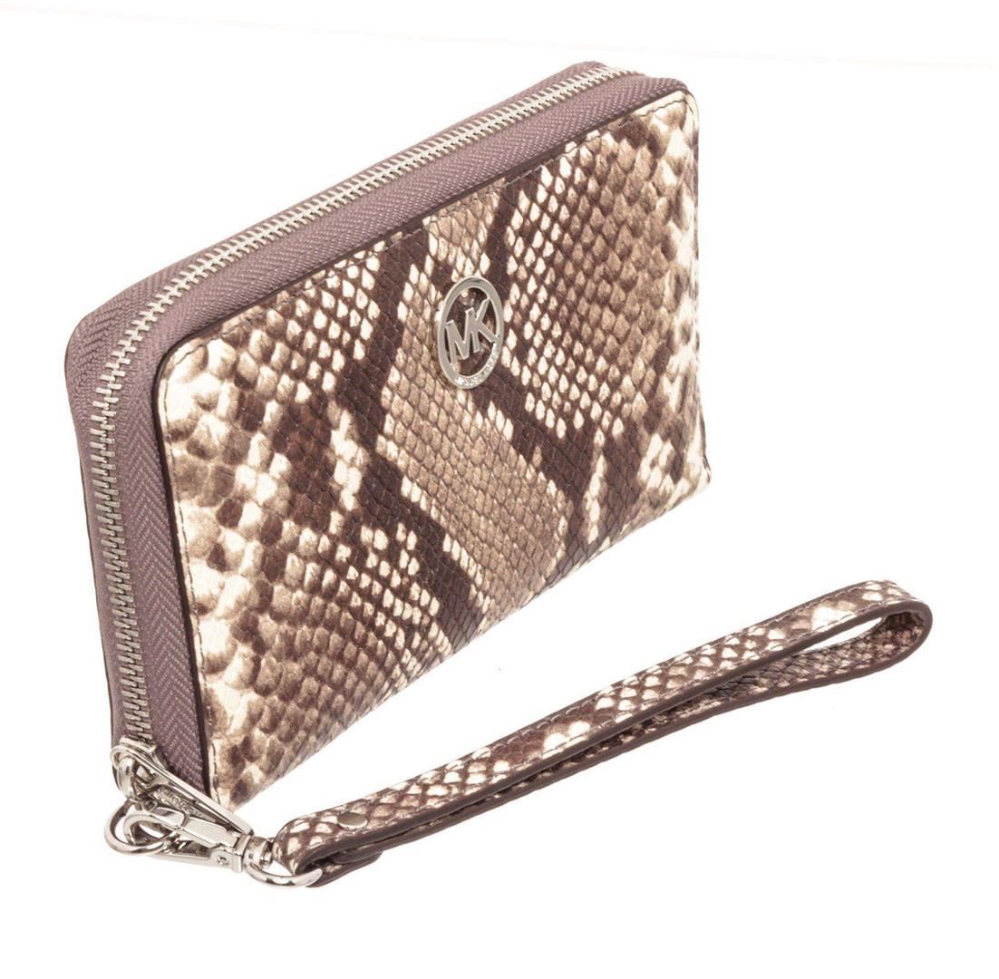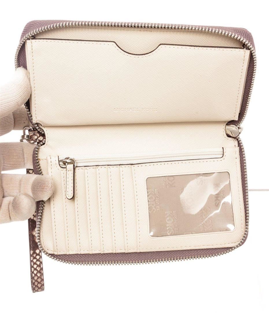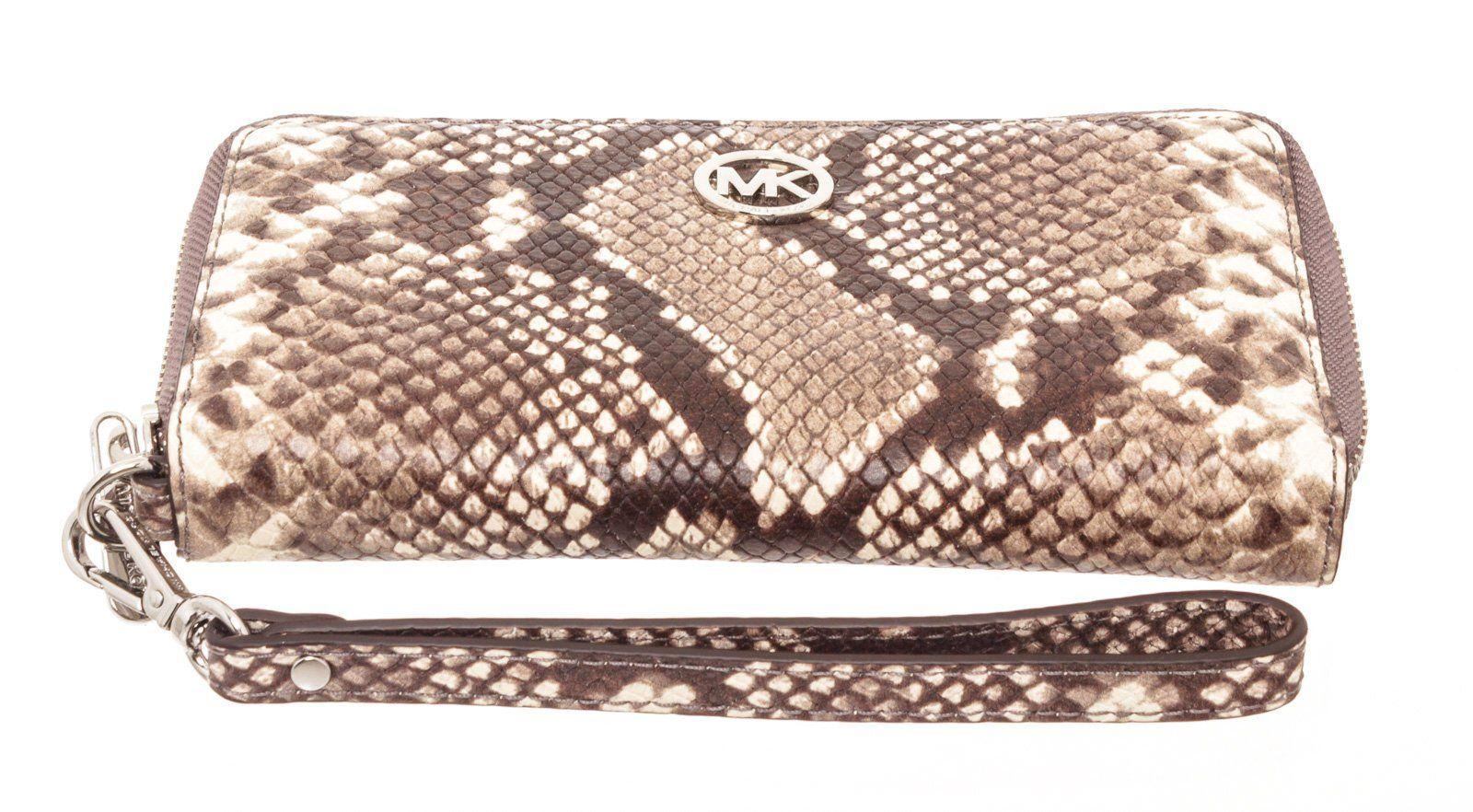 Michael Kors snakeskin embossed leather Fulton wristlet wallet with silver-tone hardware, MK logo emblem at front, single flat wristlet strap, cream interior leather lining, one phone compartment, two interior pockets; one with zip closure, eight cardholder slots and overall zip around closure. Measurements: Length: 7.8 in / 20 cm Width: 1 in / 3 cm 4.6 in / 12 cm Condition: Pre-Owned Good overall, please see photographs for detail.