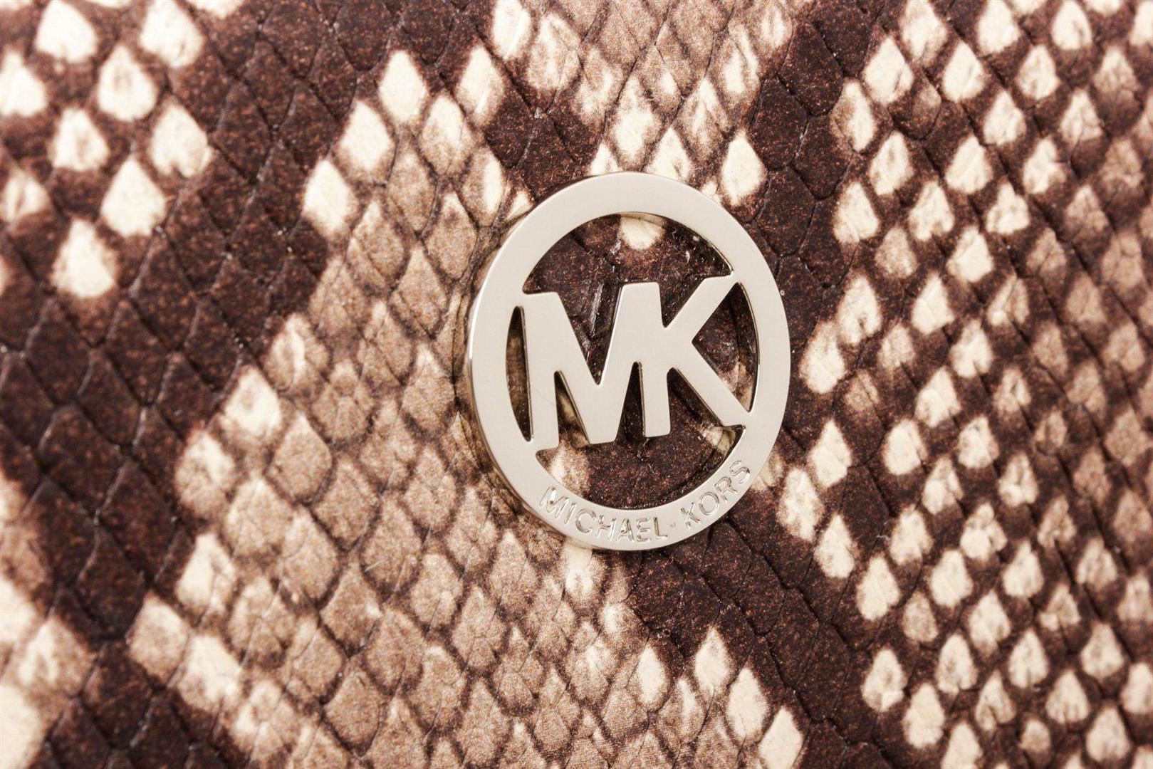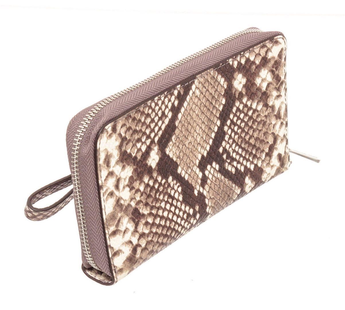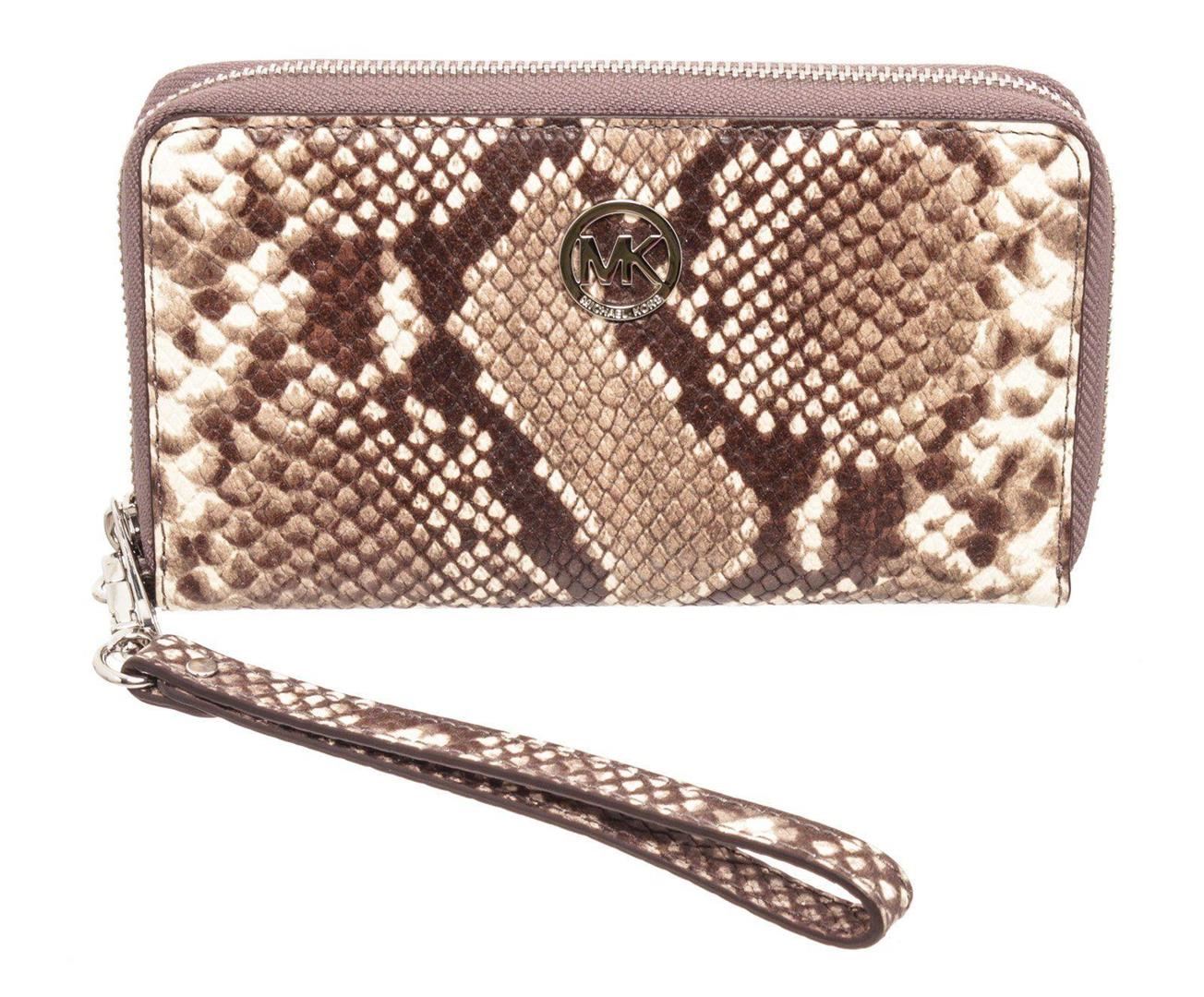 Michael Kors snakeskin embossed leather Fulton wristlet wallet with silver-tone hardware, MK logo emblem at front, single flat wristlet strap, cream interior leather lining, one phone compartment, two interior pockets; one with zip closure, eight cardholder slots and overall zip around closure. Measurements: Length: 7.8 in / 20 cm Width: 1 in / 3 cm 4.6 in / 12 cm Condition: Pre-Owned Good overall, please see photographs for detail.