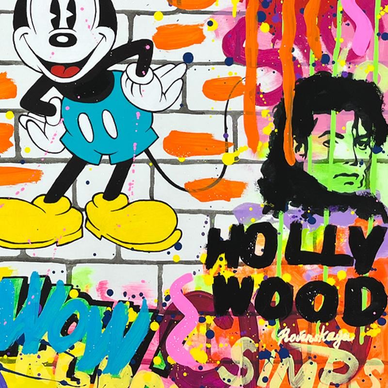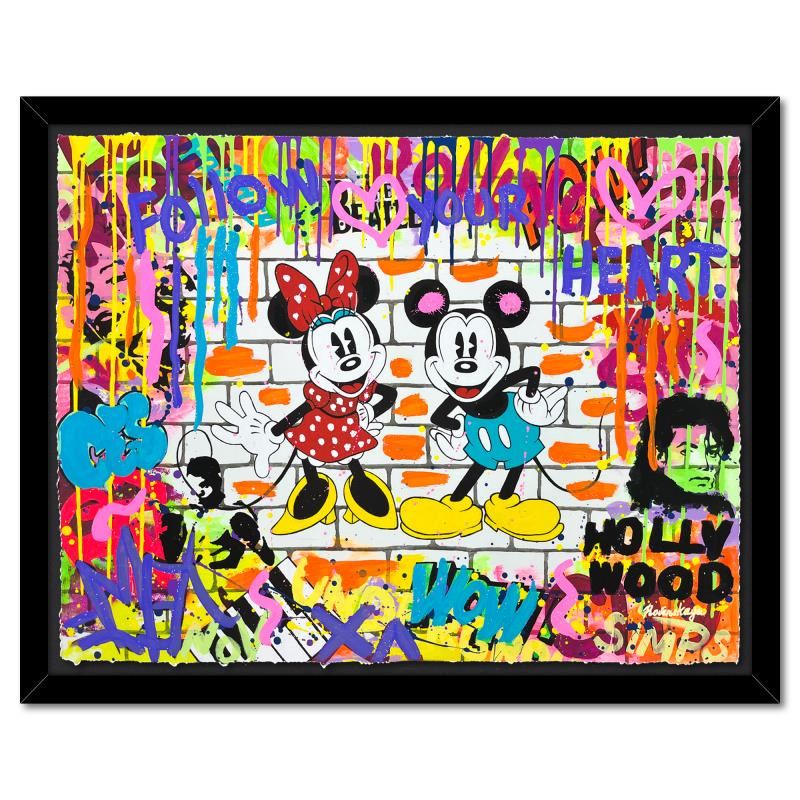 "Mickey & Minnie" is a one-of-a-kind mixed media on deckle edge paper by Nastya Rovenskaya; hand signed by the artist. This piece comes custom framed and includes letter of authenticity. Measures approximately 30" x 37" (framed), 24" x 31" (image).