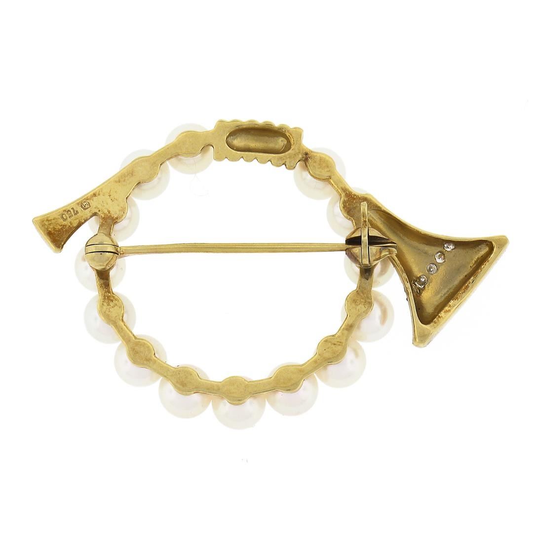 A solid 18k yellow gold horn brooch by Mikimoto, with 5 round cut natural diamonds (F/G - VS1-VS2 ; 0.06ctw), and 14 round shape cultured pearls (4.7mm). Measures 27x41.3mm and weighs a total of 6.73 grams.