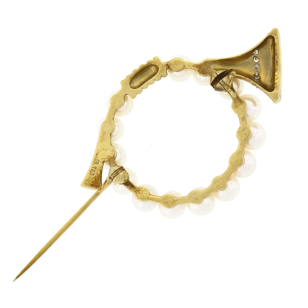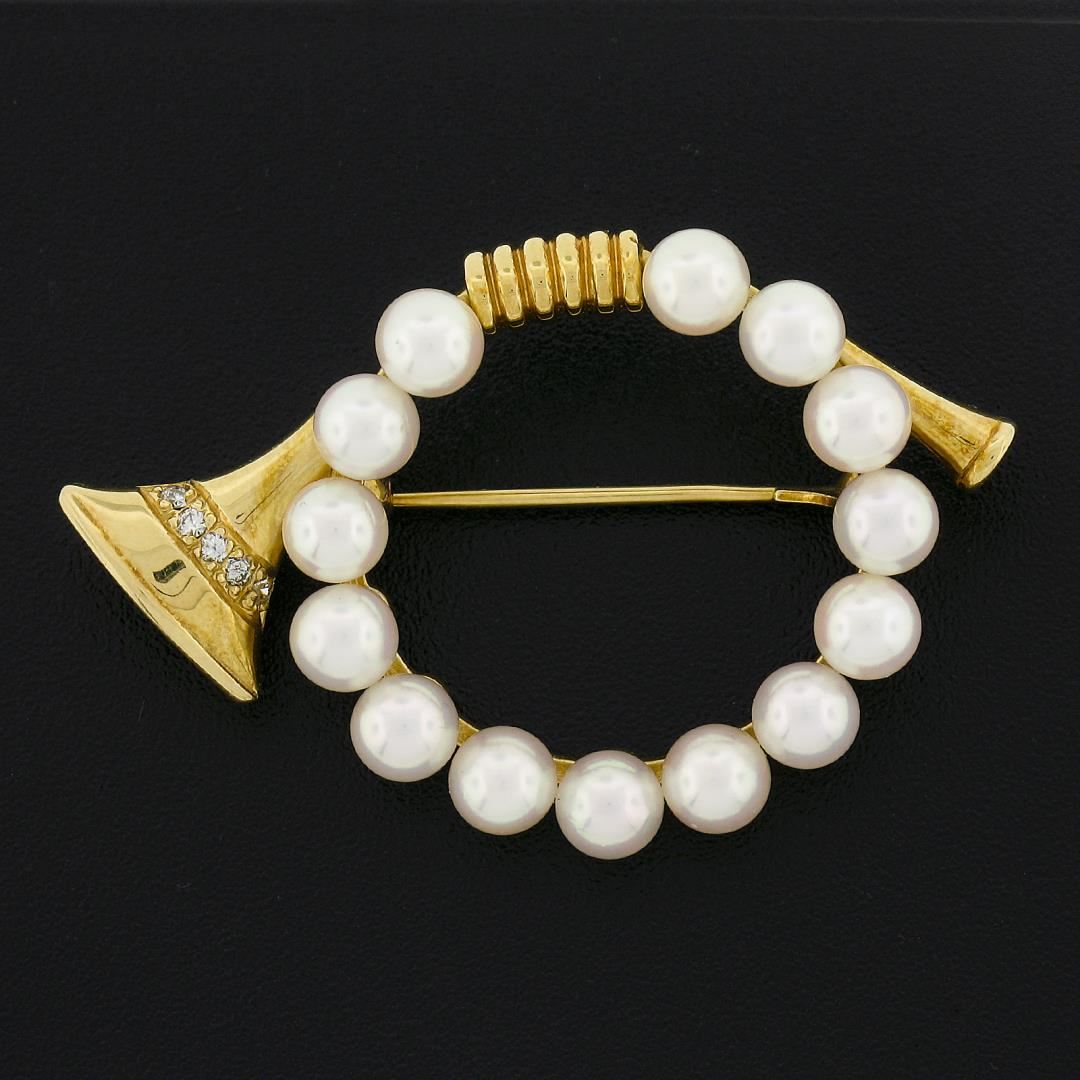 A solid 18k yellow gold horn brooch by Mikimoto, with 5 round cut natural diamonds (F/G - VS1-VS2 ; 0.06ctw), and 14 round shape cultured pearls (4.7mm). Measures 27x41.3mm and weighs a total of 6.73 grams.