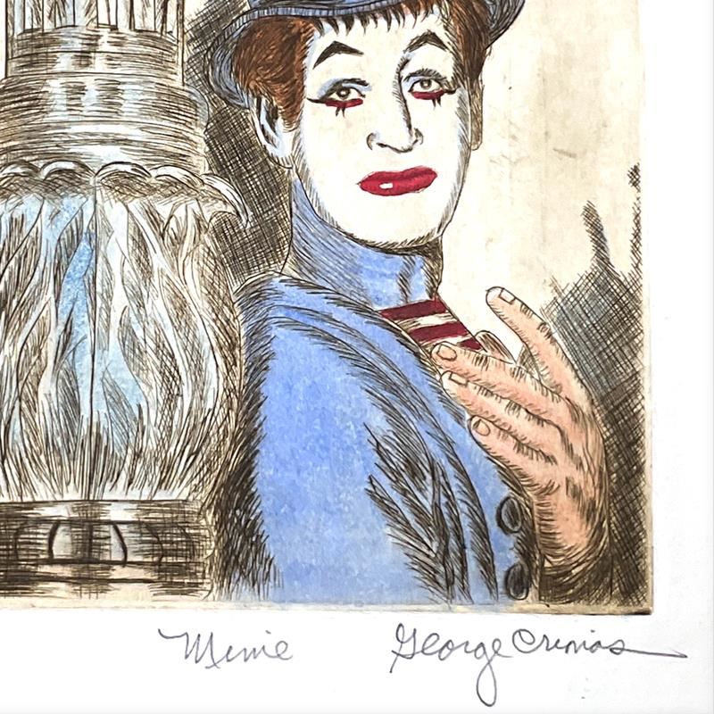 Mime by Crionas (1925-2004). "Mime" is a hand colored limited edition mixed media on paper by George Crionas (1925-2004), numbered and hand signed by the artist. The hand coloring varies slightly from piece to piece. Includes Letter of Authenticity. Measures approx. 10" x 13" (border); 5" x 6" (image). The paper in the border area is slightly wavy but does not affect the artwork itself.