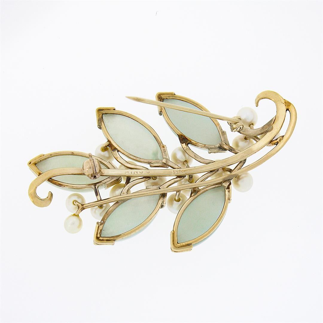 A solid 14k yellow gold pin brooch by Ming's, featuring 5 marquise cabochon cut natural jade (15.9x7.9mm each), and 15 round shape cultured pearls (3.6 to 4.9mm each). Measures 33x54.70mm and weighs a total of 13.42 grams.