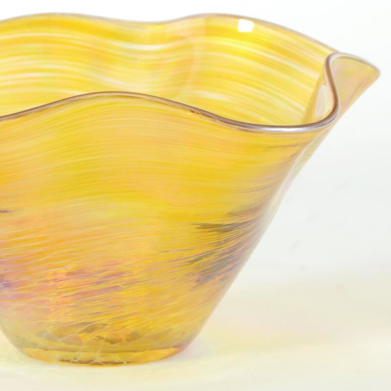 "Mini Wave Bowl (Gold)" is a hand blown glass bowl (second) from Glass Eye Studios. This piece contains ash from the 1980 volcanic eruption of Mount St. Helens. As each piece is individually handcrafted, the pattern in the glass may vary slightly from the image shown. "Second" means very slightly imperfect, but still great quality. Measures approx. 6" x 3".
