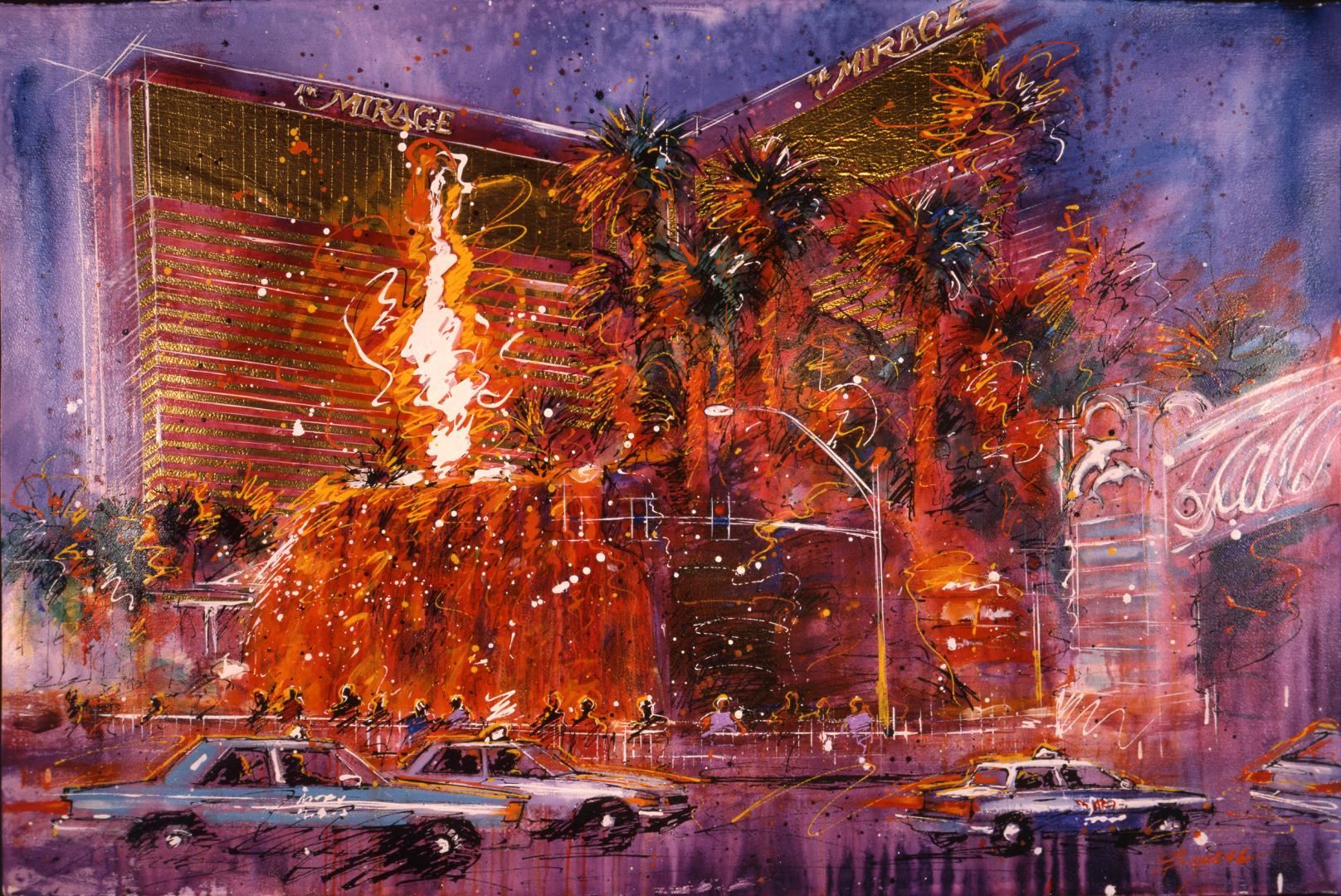 Michael Bryan takes us to the Las Vegas Strip for another look at the famous Mirage Hotel with it's exploding Volcano. This image is a Unique 1/1 hand-painted 26x40" giclee on canvas.
