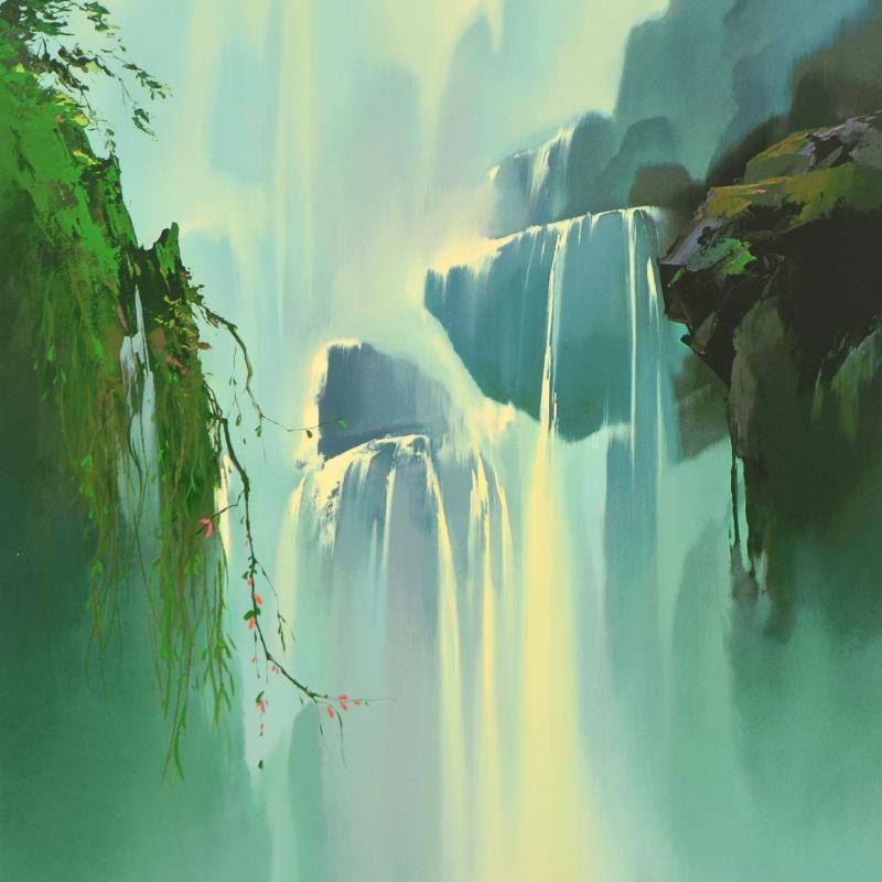 "Misty Falls" is a limited edition giclee on paper by Thomas Leung, numbered and hand signed by the artist. Includes Letter of Authenticity. Measures approx. 30" x 39.5" (border), 26" x 35" (image).