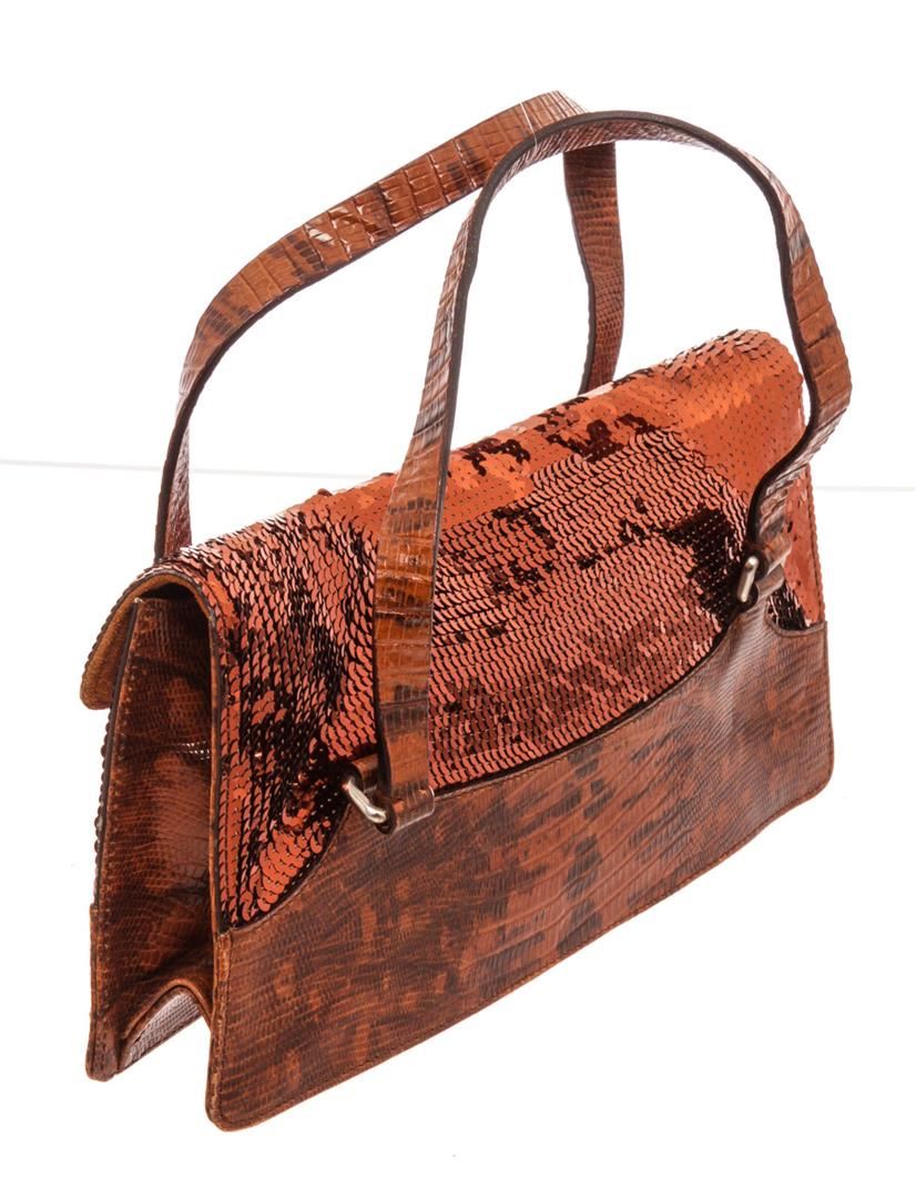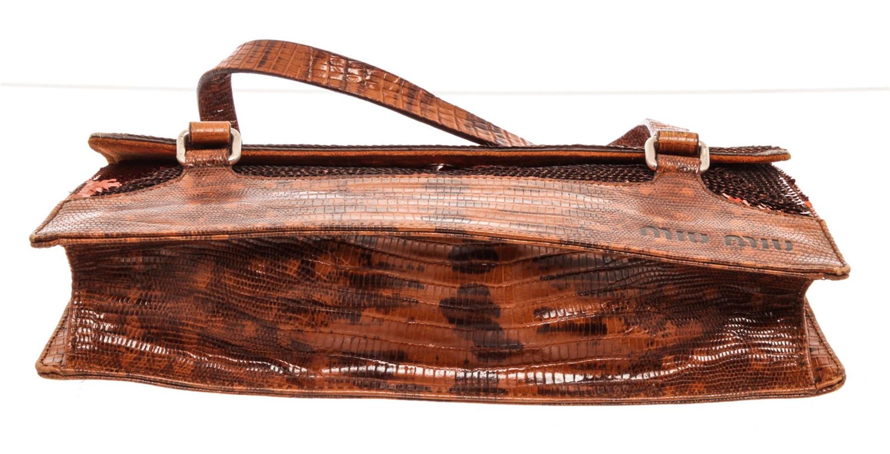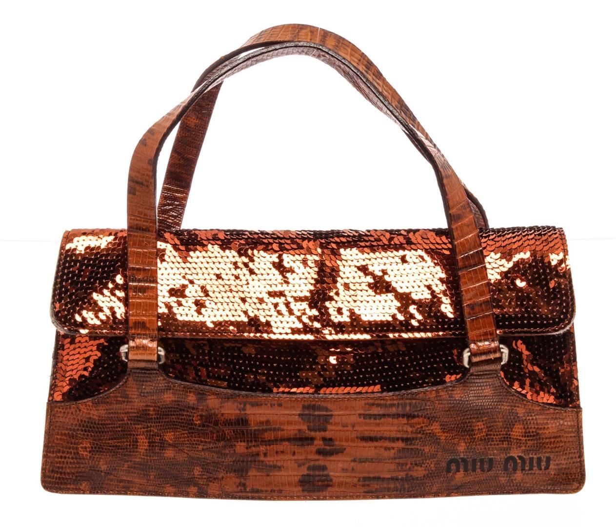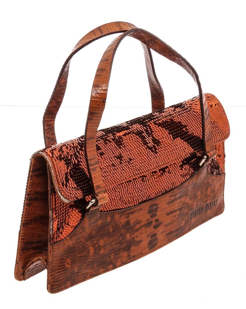Miu Miu Red Lizard Sequin Shoulder Bag with gold-tone hardware, interior zip pocket, shoulder strap and snap closure.
