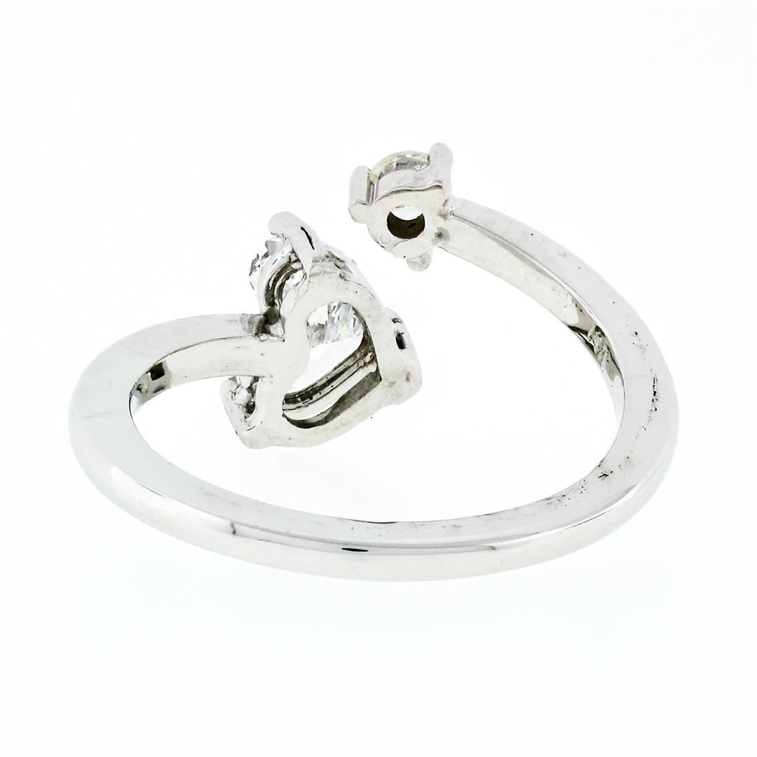 A modern solid 14k white gold bypass ring with 1 GIA certified heart cut natural diamond (D - VS1; 0.71ct) and 1 round brilliant cut natural diamond (G - VS2; 0.13ct). The ring is size 7.0, weighs a total of 3.35 grams, and measures 12.5mm wide. Comes with all original relevant certifications.