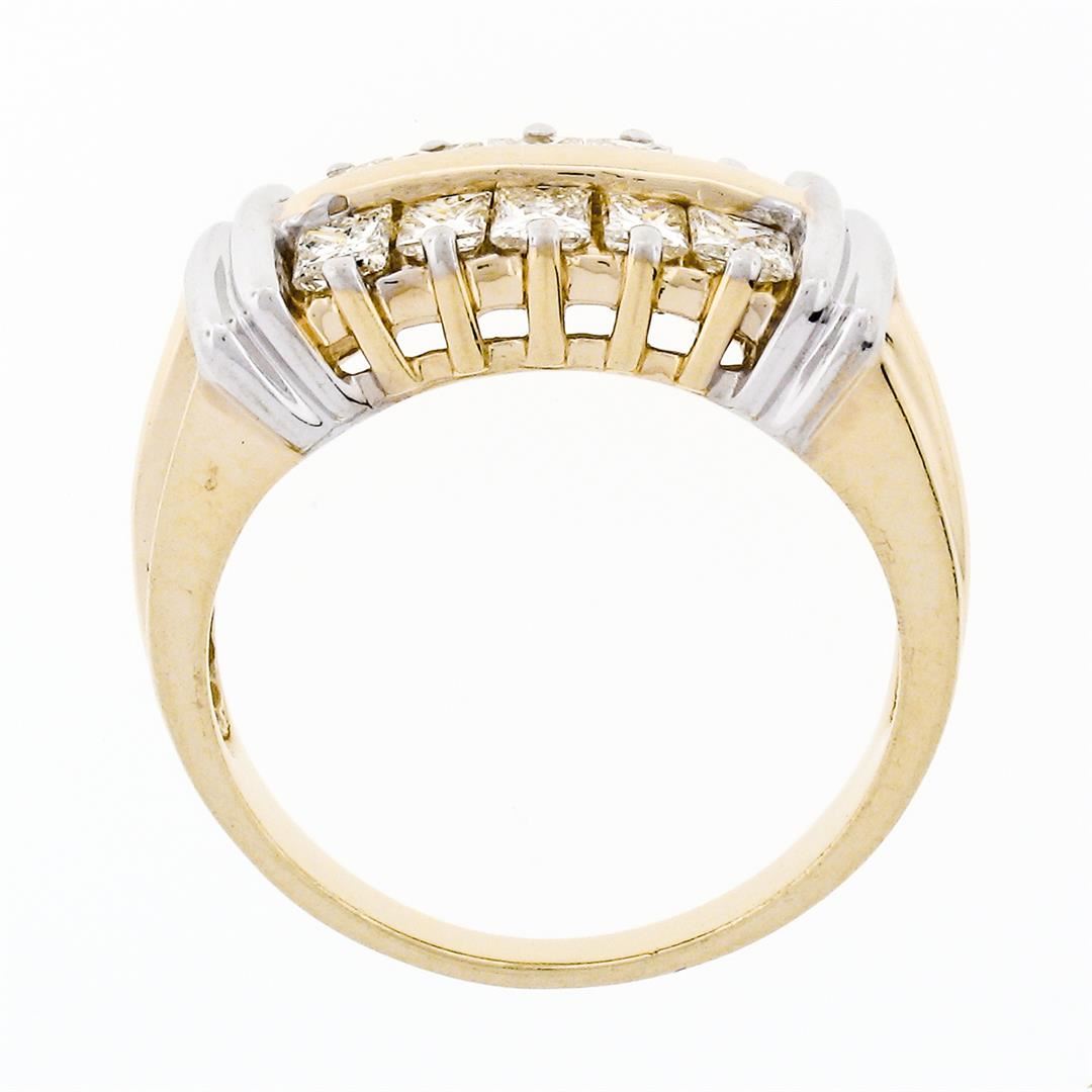 An estate solid 14k yellow & white gold wide band ring, featuring 10 princess cut natural diamonds (J/K Color - VS2-SI2 ; 1.10ctw). The ring is size 7, weighs a total of 4.85 grams, and measures 7.40mm wide.