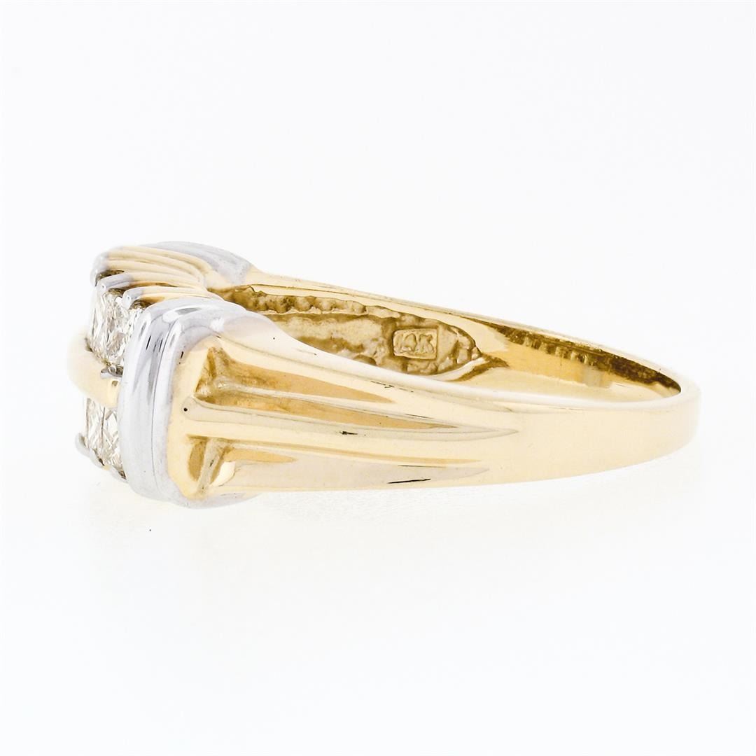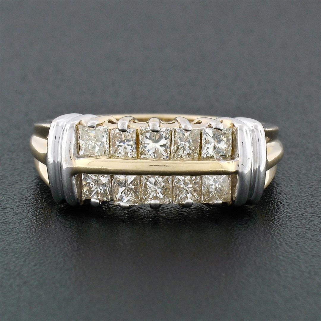An estate solid 14k yellow & white gold wide band ring, featuring 10 princess cut natural diamonds (J/K Color - VS2-SI2 ; 1.10ctw). The ring is size 7, weighs a total of 4.85 grams, and measures 7.40mm wide.