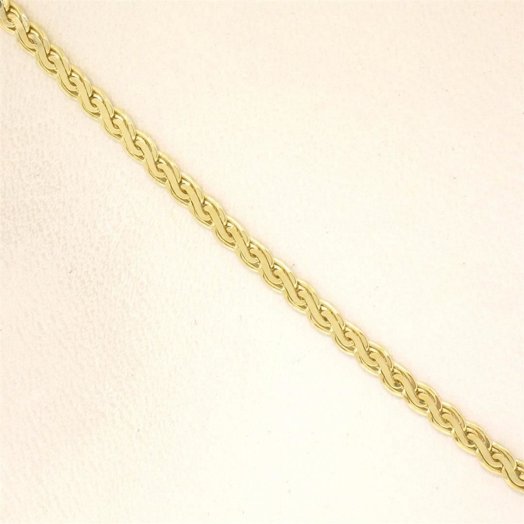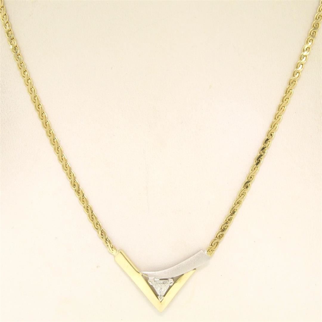 An estate solid 14k white and yellow gold V necklace, with 1 trillion cut natural diamond (H- SI1; 0.30ct). 17 inch S link chain, 8.70 grams total weight, pendant measures 17x25mm.