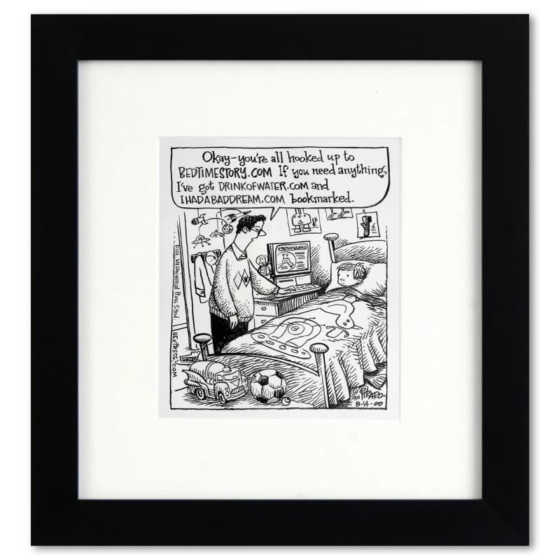 Enter a surreal and satirical world of twisted imagination and award winning creativity. "Modern Bedtime" is an original pen & ink drawing on paper by Dan Piraro, creator of the critically acclaimed and award winning comic strip, Bizarro. This piece is hand signed, comes custom framed and includes a letter of authenticity. Measures approximately 12" x 11" (frame), 7" x 6" (image).This item requires special handling and may have a longer than usual turnaround.