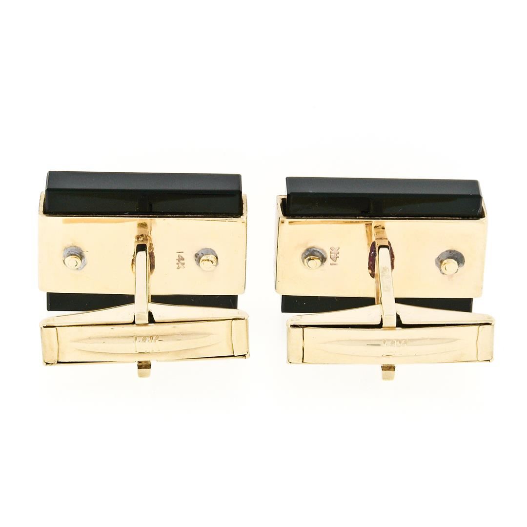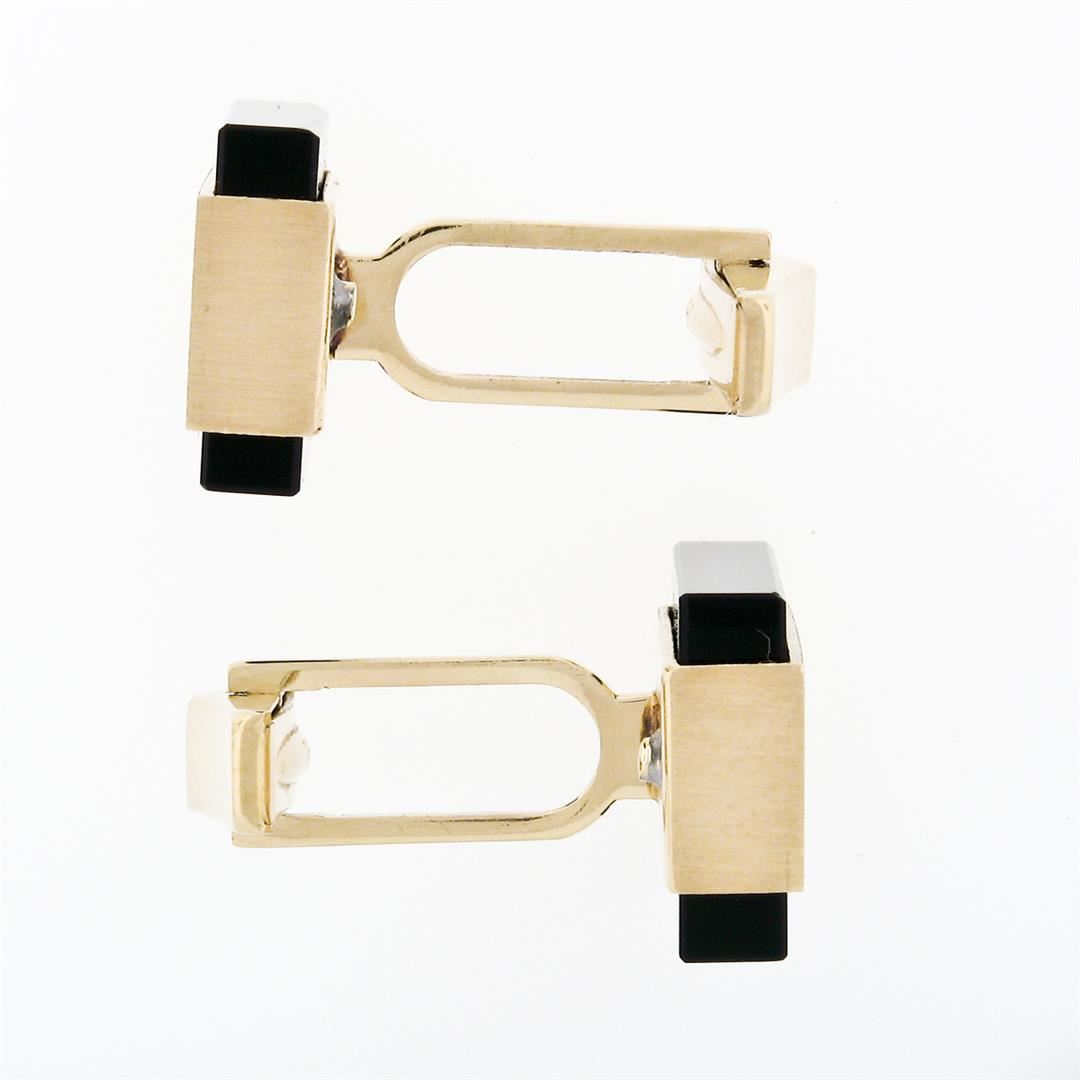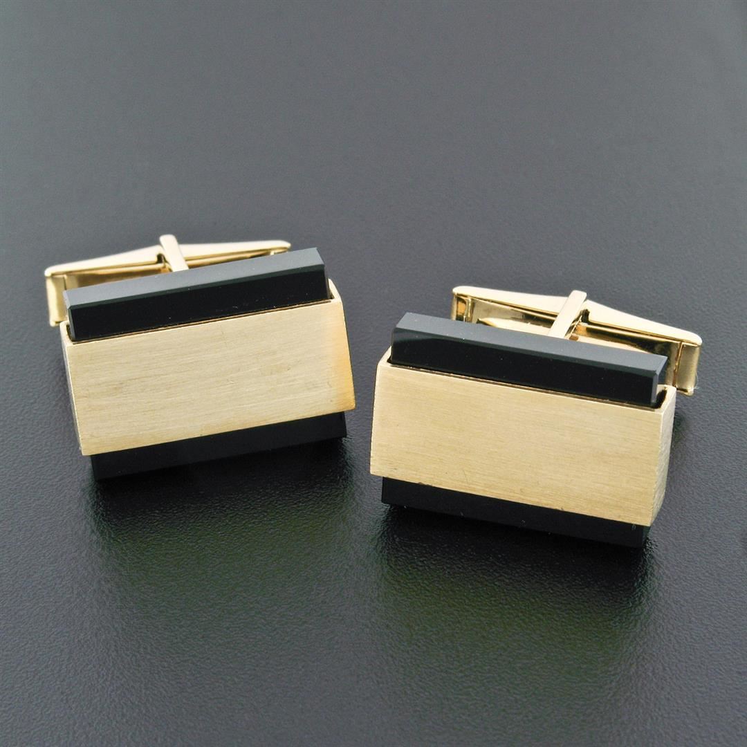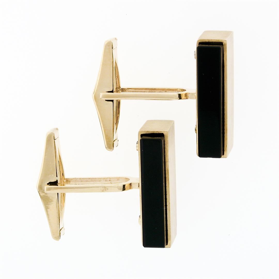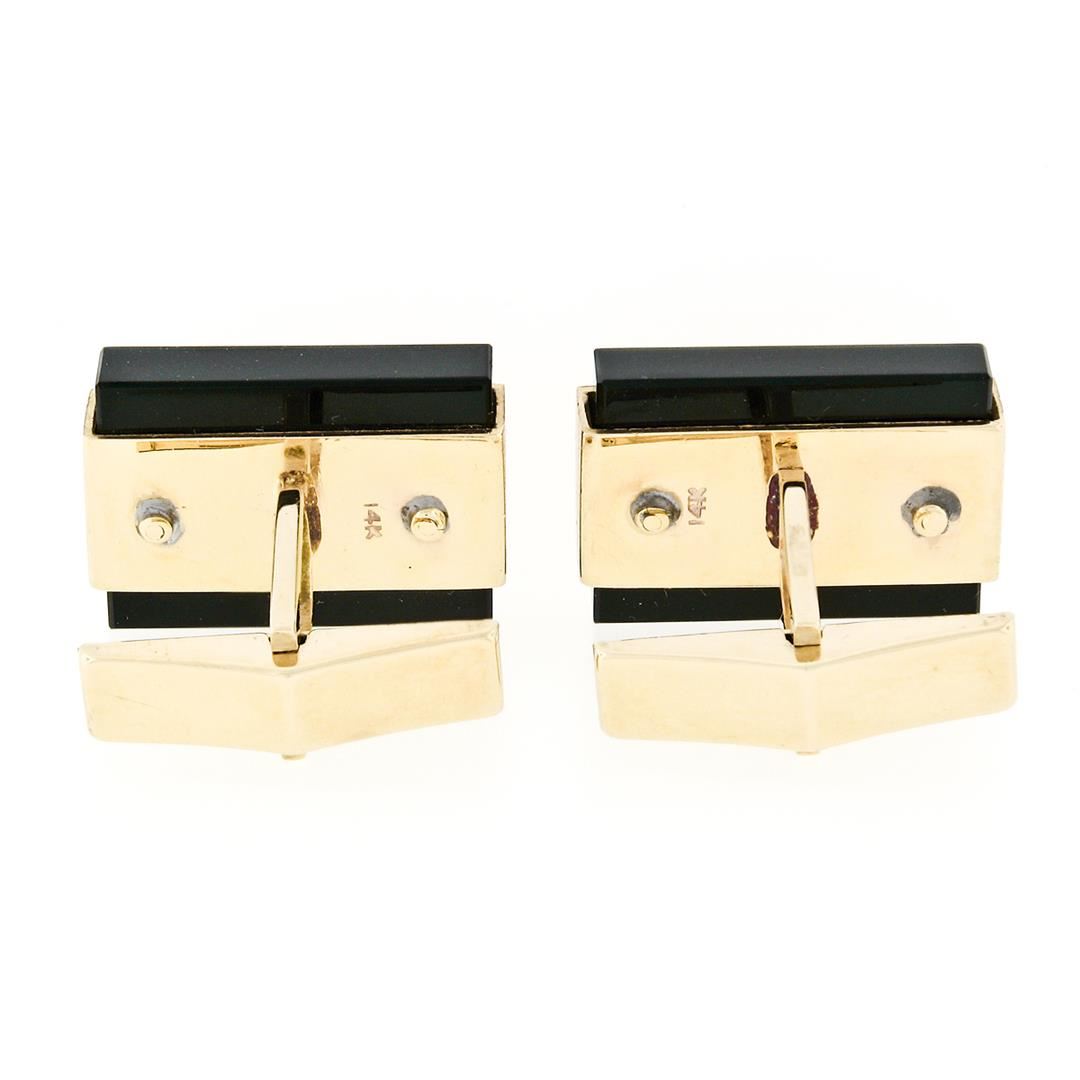 A pair of modernist solid 14k yellow gold brushed cufflinks with 2 rectangular cut natural black onyx (19.1x13.8mm). These cuff links have a swivel back design with a clearance of 13.5mm, weigh a total of 16.86 grams, and the front panels measure 20.6x13.8mm.
