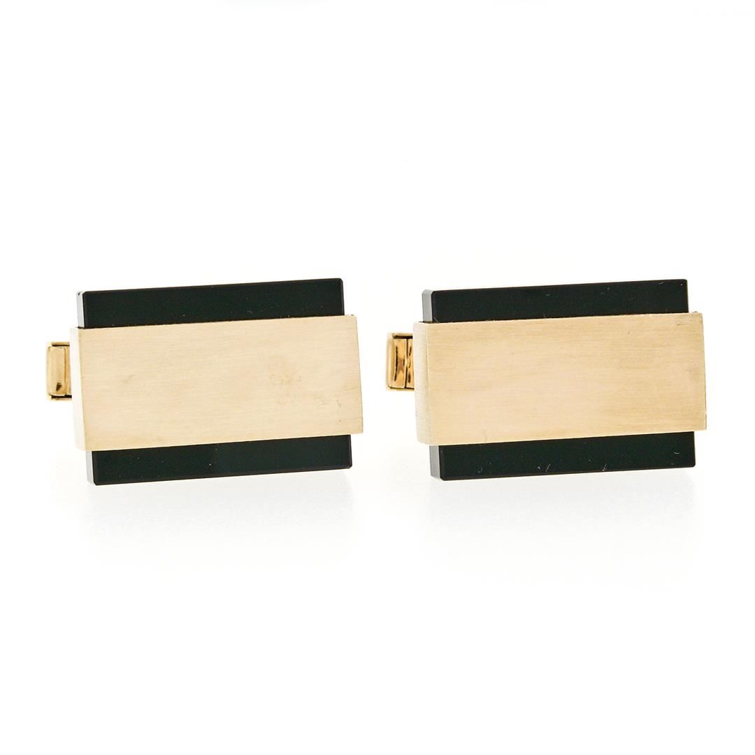 A pair of modernist solid 14k yellow gold brushed cufflinks with 2 rectangular cut natural black onyx (19.1x13.8mm). These cuff links have a swivel back design with a clearance of 13.5mm, weigh a total of 16.86 grams, and the front panels measure 20.6x13.8mm.