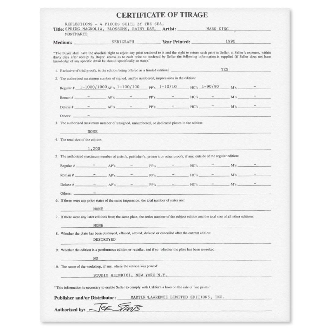 "Montmartre" is a limited edition serigraph on paper by Mark King (1931-2014). Hand signed and numbered, this piece comes with a letter of authenticity and measures approximately 15" x 20" (image).