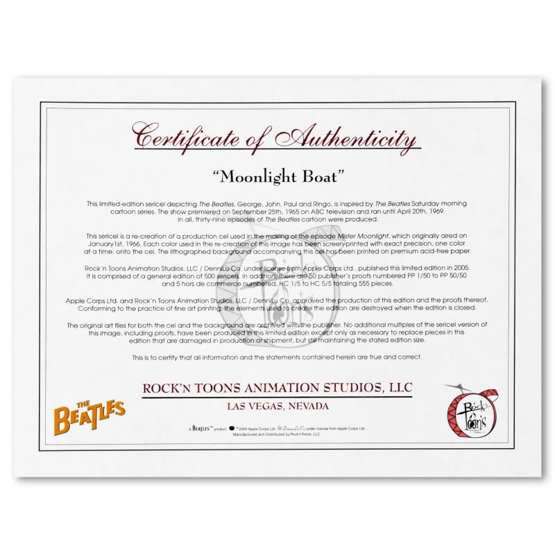 "Moonlight Boat" is a limited edition sericel inspired by The Beatles Saturday Morning Cartoon series. This piece is from an edition of 500. This piece comes matted. Includes Certificate of Authenticity. Measures approx. 18" x 18" (matting), 14" x 14" (image).