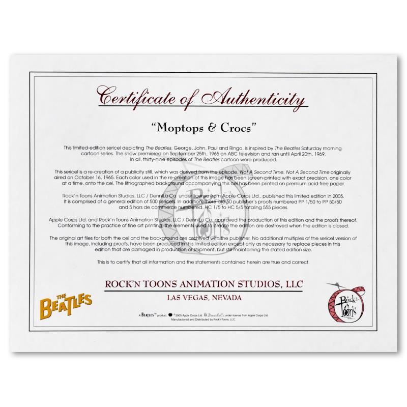 "Mop Tops and Crocs" is a limited edition sericel inspired by The Beatles Saturday Morning Cartoon series. This piece is from an edition of 500. This piece comes matted. Includes Certificate of Authenticity. Measures approx. 28" x 18" (matting), 24" x 14" (image).