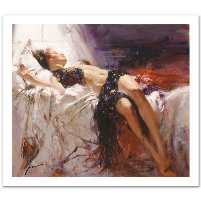 "Morning Dreams" is a limited edition giclee on paper by Pino (1939-2010), numbered and hand signed by the artist. Includes Certificate of Authenticity. Measures approximately 16" x 18.5" (image).