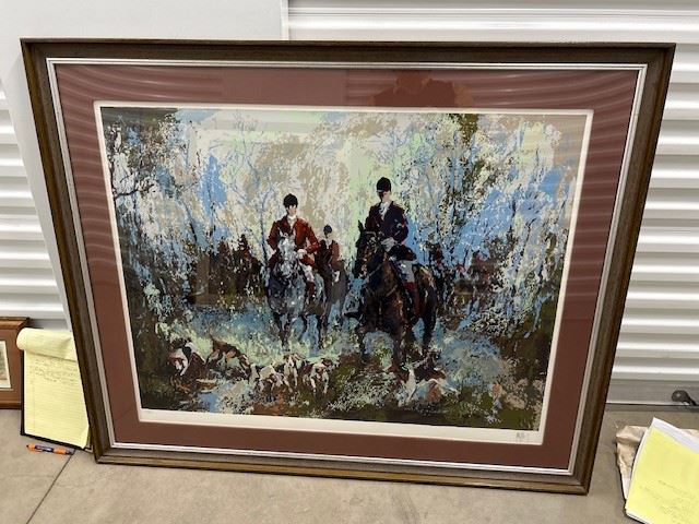 A framed serigraph by the late great Mark King, feasturing a Fox Hunt through the woods. #104/325. Frame is old but good 50.5x41"