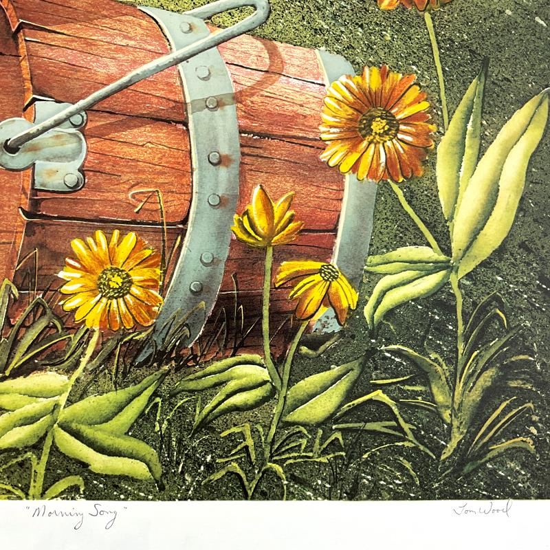 Morning Song by Wood, Tom. "Morning Song" is a limited edition lithograph on paper by Tom Wood, numbered and hand signed by the artist. Includes Letter of Authenticity. Measures approx. 29" x 22" (border), 23" x 17.5" (image). There may be minor imperfections in the white border area but the piece is in overall good condition.