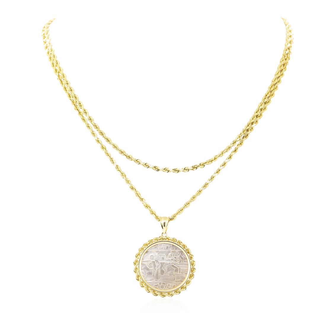 One electronically tested 14KT yellow gold lady's combination cast & assembled fashion pendant & chain 37.0' long, 3.00mm diamond cut rope chain with a lobster claw clasp with a bright polish finish. The featured pendant contains one hand-engraved mother GAS Appraised.