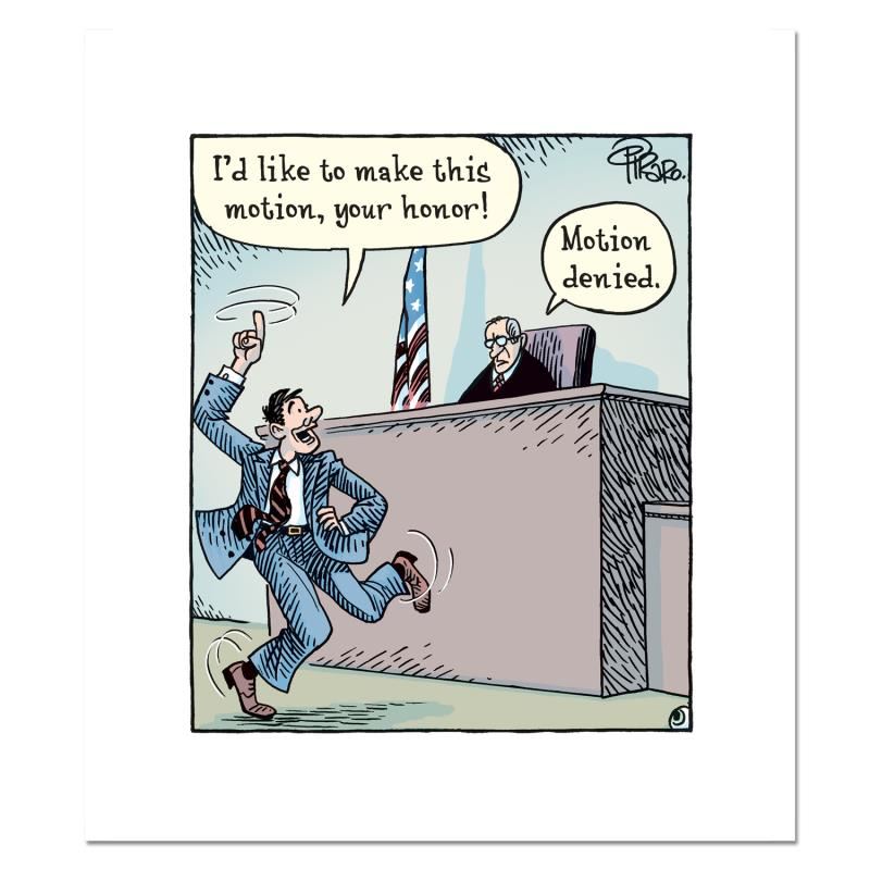 "Motion Lawyer" is a limited edition giclee on paper by Dan Piraro, creator of the critically acclaimed and award winning comic strip, Bizarro! This piece is numbered and hand signed by the artist and includes a letterof authenticity. Measures approximtely 8" x 15" (image).