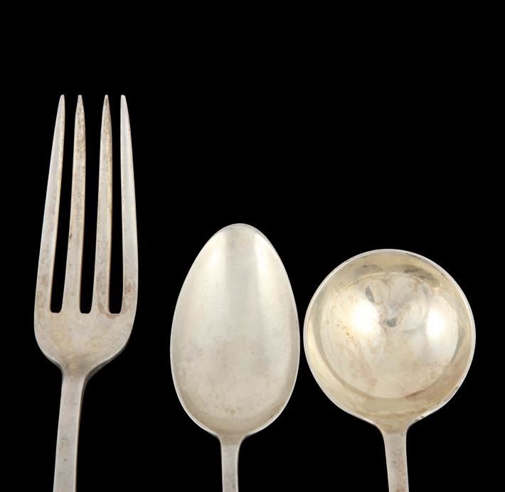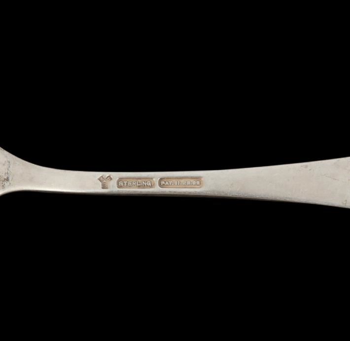 "Mount Vernon" pattern by Lunt circa 0905. This (5) piece lot of antique sterling consists of: (2) dinner forks 7.5". (2) teaspoons 5.75". (1) chocolate spoon 5.50". No monograms.
