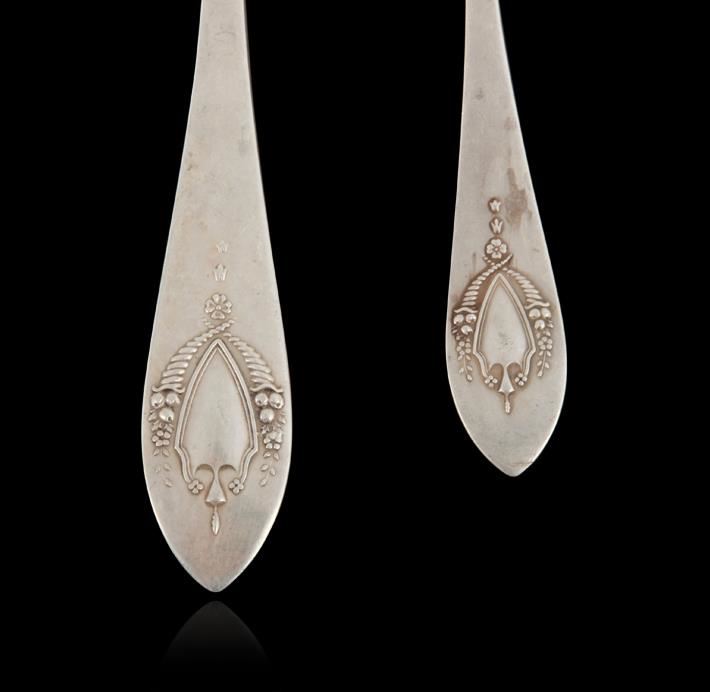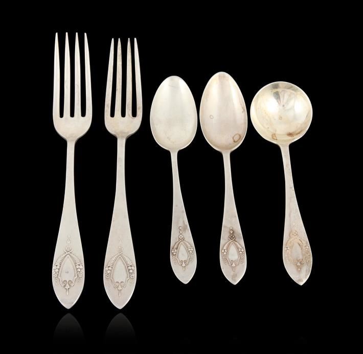 "Mount Vernon" pattern by Lunt circa 0905. This (5) piece lot of antique sterling consists of: (2) dinner forks 7.5". (2) teaspoons 5.75". (1) chocolate spoon 5.50". No monograms.
