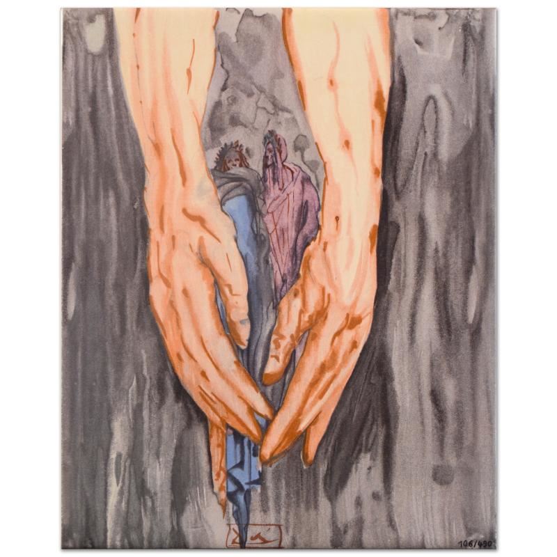 "Mount of Geryon Inferno Canto" is a limited edition glazed ceramic tile from a SOLD OUT edition by Salvador Dali (1904-1989), numbered and plate signed! This piece illustrates Dali's interpretation of canto 18 of "The Inferno", from the epic poem "The Divine Comedy". Measures approx. 8" x 10" (tile).
