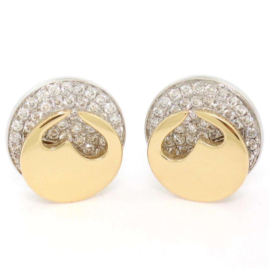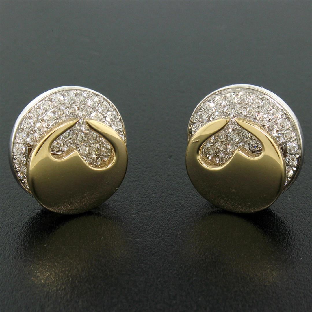 Movado 18K Two Tone Gold 1.80ctw FINE Round Diamond & Heart Disk Button Earrings. Please see photos and description for all available information. An estate solid 18k yellow and white gold button earrings by Movado, featuring 66 round brilliant cut natura