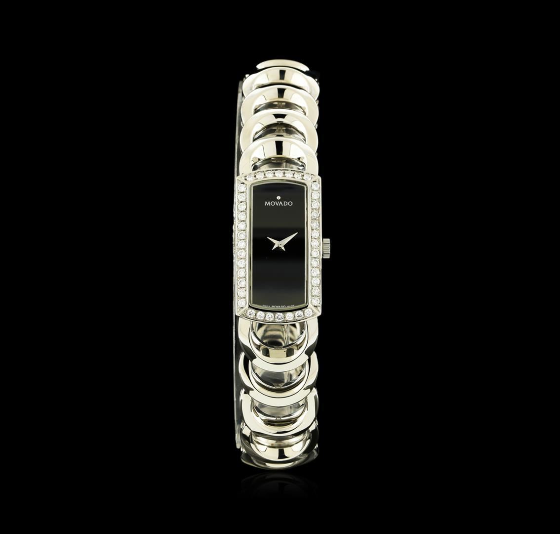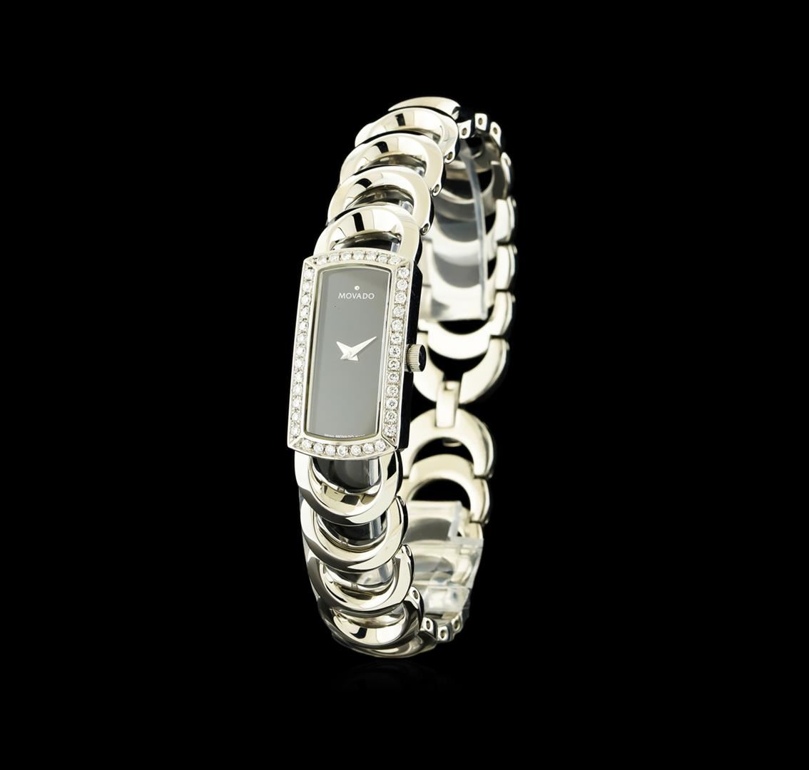 One Movado Rondiro ladies watch. Movement: Quartz. Model: 84 H5 1411. Functions: Hours and minutes. Case: Stainless steel. Bezel: Diamond set stainless steel. Dial Color: Black (monogrammed with a dot marker at the 12 o'clock position). Bracelet: Stainless steel circles.