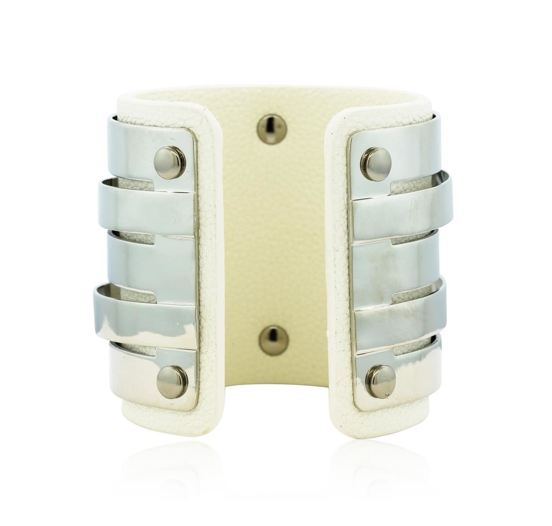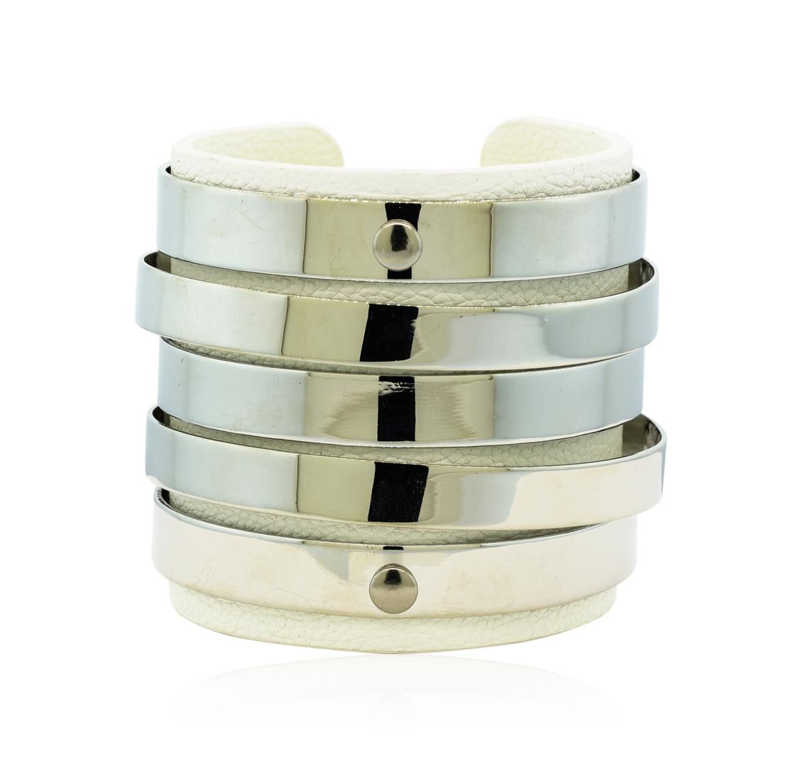 High end designer jewelry. Multi Bangle Design Cuff Bracelet - Metal and Leather. Metal& Leather Bracelet. White/ Silver. One Size.