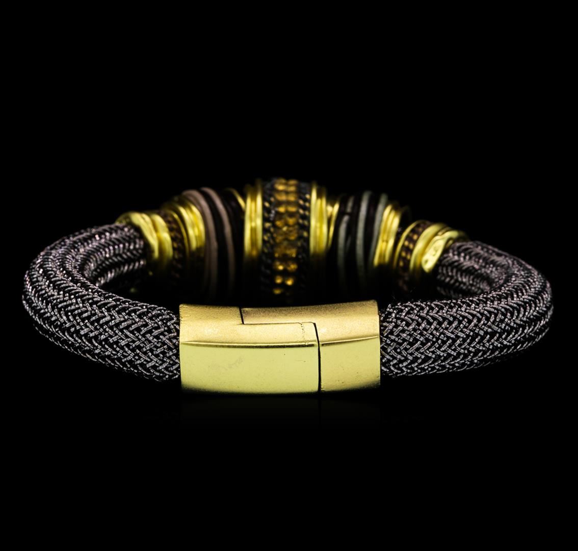 High end designer jewelry. Multi Charm Design Lurex Bracelet - Gold Plated. Gold Plated Metal/ Mag Clasp. Brown/ Gold. 7.8inches.
