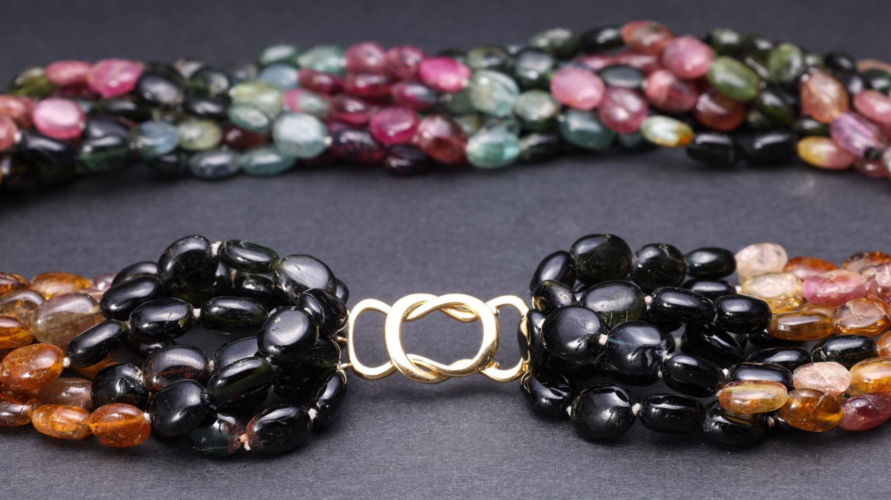 Multi-strand Tourmaline Necklace with 14K Yellow Gold Clasp. Total weight of 146 gm. Estimated retail value $1,200.