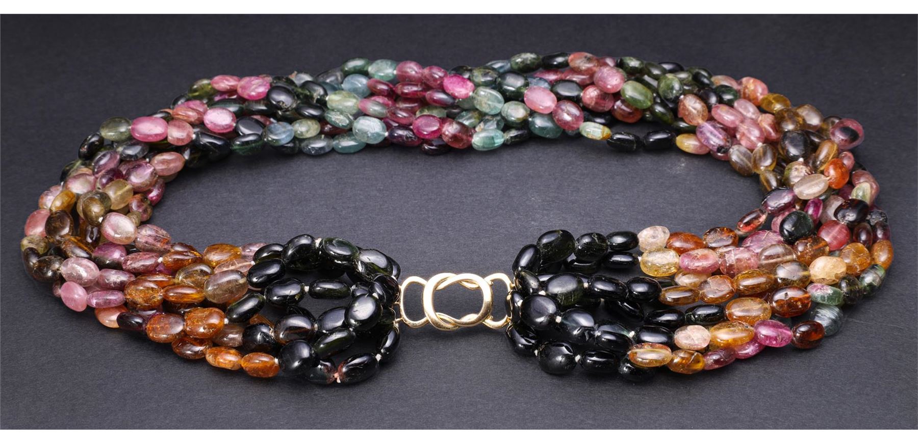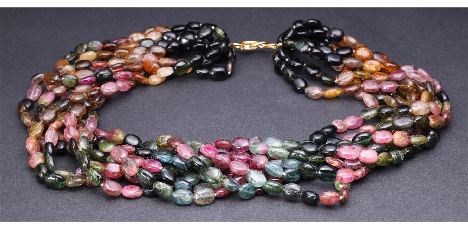 Multi-strand Tourmaline Necklace with 14K Yellow Gold Clasp. Total weight of 146 gm. Estimated retail value $1,200.