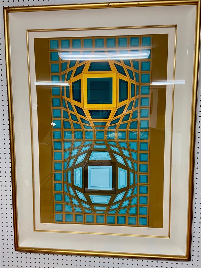 Modern master VASARELY breaks it down into cubist construction. A 48x35" framed serigraph hand-signed number 293/300.Frame has a small smudge in the gold leaf at top, sold AS IS easily retouched. COA