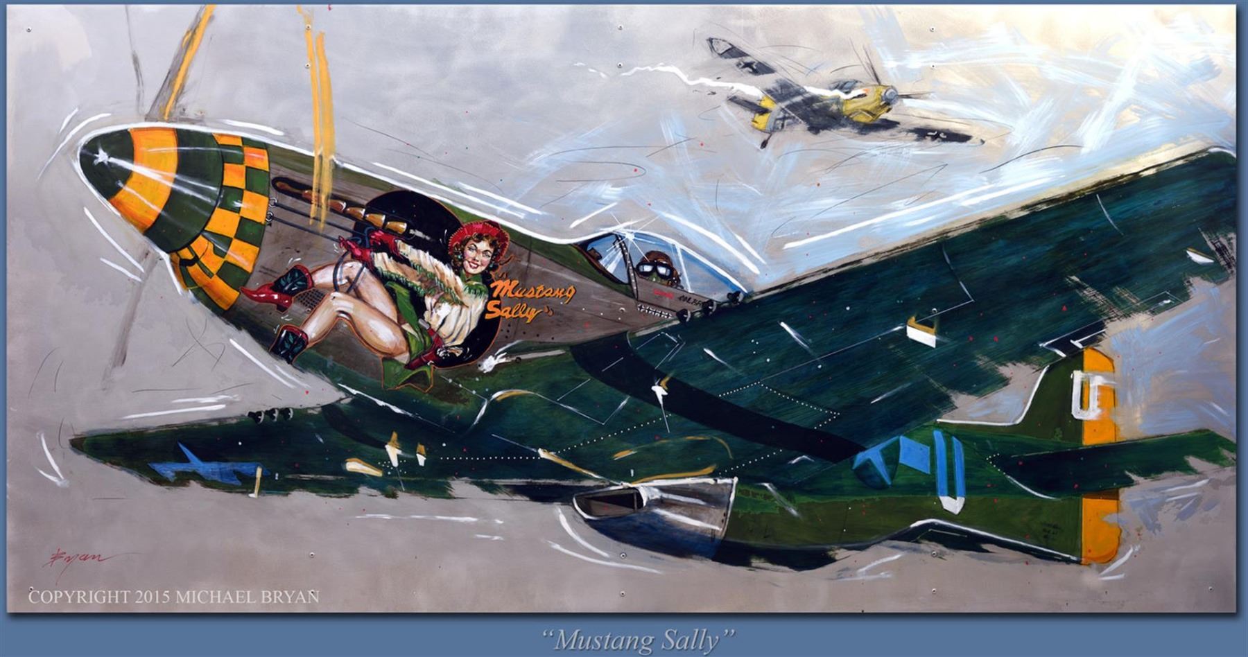 Michael Bryan's pin-up girl WWII fighter is brought to life in "Mustang Sally", a 20x40" Unique hand-worked giclee on canvas numbered 1/1